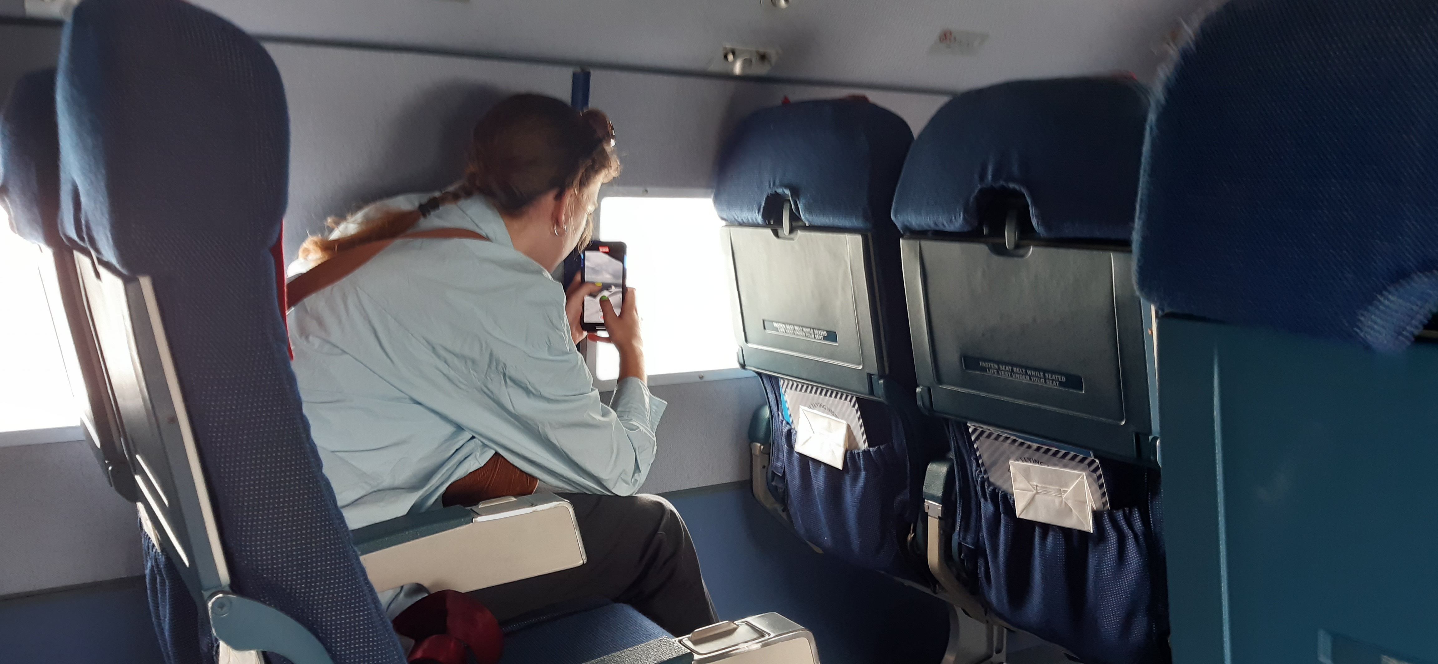Er zijn 18 passagiers op 18 stoelen; ruimte genoeg dus. Na het opstijgen mogen we vrijuit door het vliegtuig bewegen: een ander raampje opzoeken, eventueel in de open ruimte waar de liefhebbers op de vloer zitten met hun super camera’s, even in de cockpit kijken..