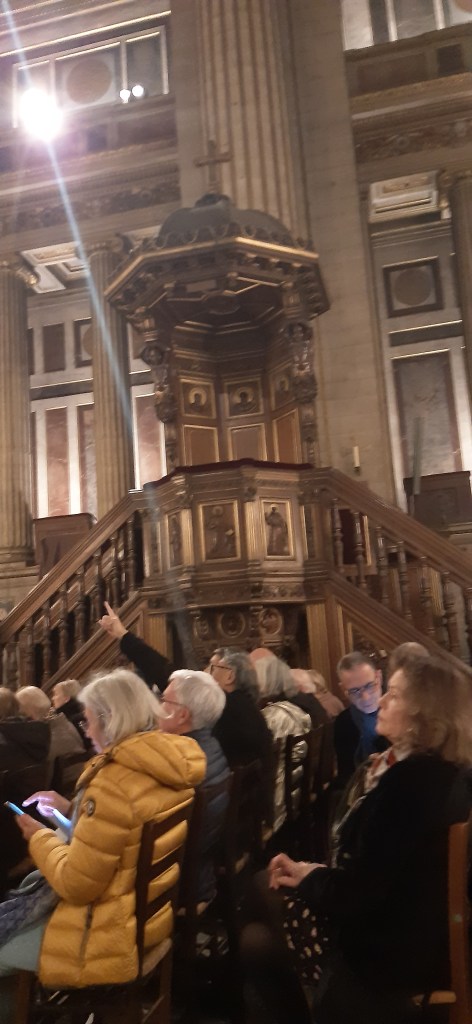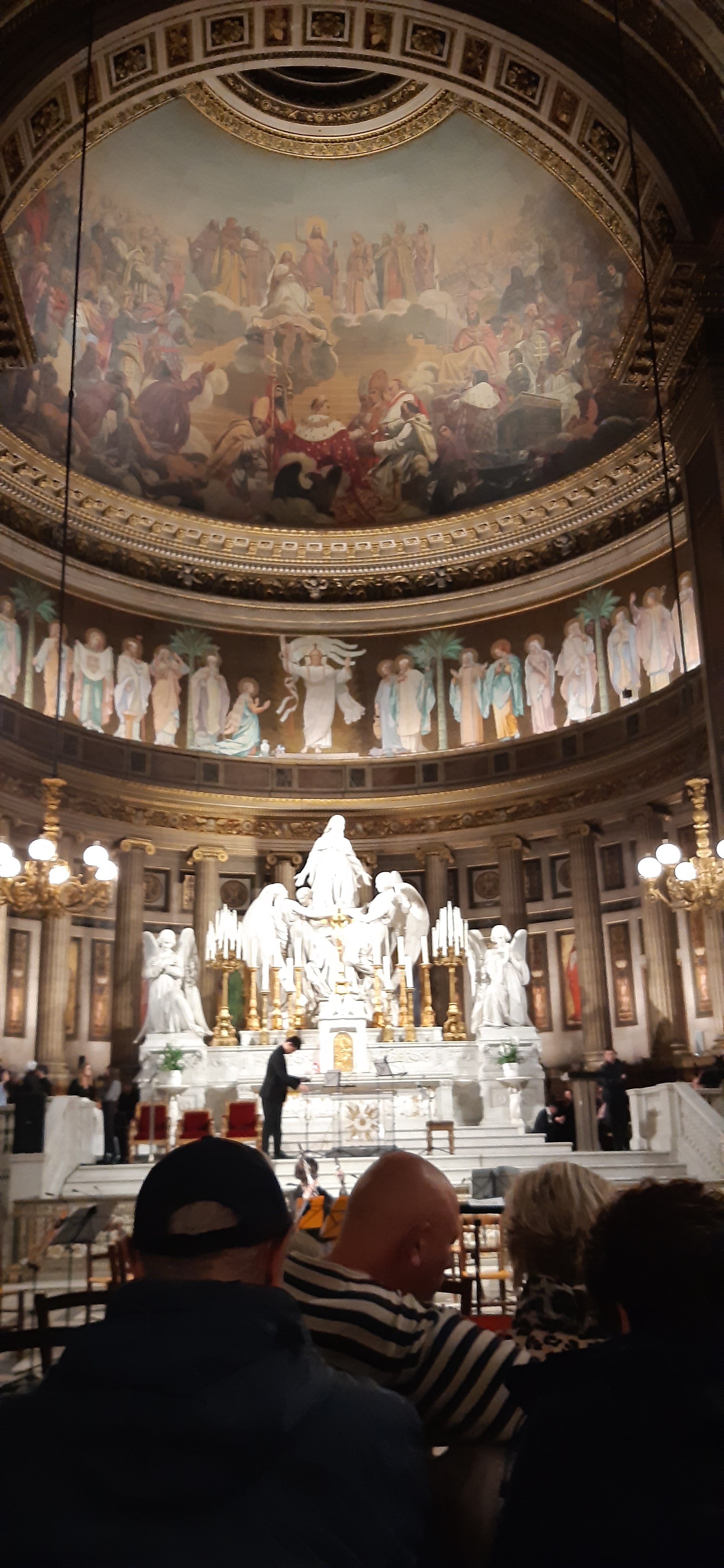 Van tevoren had ik voor verschillende musea een tijdslot geboekt ( zo gaat dat tegenwoordig; voor Pompidou was ik nog maar net op tijd voor een tijdslot om half 1 op mijn dag van vertrek) maar nog niet toegekomen aan het uitzoeken van een concert – of twee. Zoek op concert, genre, plaats en periode, en er komt vaak wat leuks tevoorschijn. Nu trof ik het: 30 oktober, mijn dag van aankomst, was er in de Eglise de Madeleine een concert ter herinnering aan de uitvaartdienst voor Frederic Chopin, precies 175 jaar eerder op diezelfde plek. Een orkest (Hélios) had het initiatief genomen voor een eenmalig programma met enkele Chopin walsen uitgevoerd door strijkkwartet, een nocturne ook van Chopin met een kwintet. Dan een medley van maconnieke rouwstukken door het orkest en tot slot, indertijd op verzoek van Chopin zelf, het hele Requiem van Mozart met orkest, groot koor en solisten! Toen mochten vrouwelijke solisten nog niet in de kerk optreden maar de zangeressen stonden achter een gordijn.