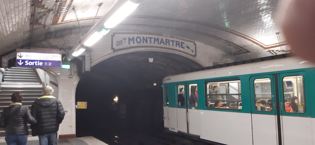 Ik vond het weer een genot om vlot van hot naar her te gaan met de metro; het kaartjessysteem is aan het veranderen. Lange tijd zorgde ik dat ik nog een kaartje overhield van mijn carnet van 10 zodat ik niet direct naar een loket hoefde; ik gaf ook rustig anderen mijn overgebleven kaartjes mee onder voorwaarde dat ze er minstens 1 aan mij teruggaven. En ja, nu, jaren later deden die kaartjes het nog steeds! Maar inmiddels trek je een digitaal dagkaartje uit de automaat dat steeds weer werkt als je bovengronds bent geweest, en het is heel goedkoop. Parijs bevordert echt het openbaar vervoer. Voor het eerst zag ik nu de aanduidingen op de Oude Lijn waar de trein het station verlaat: wat de richting is.