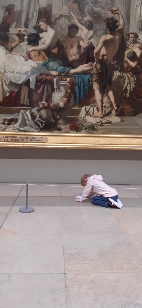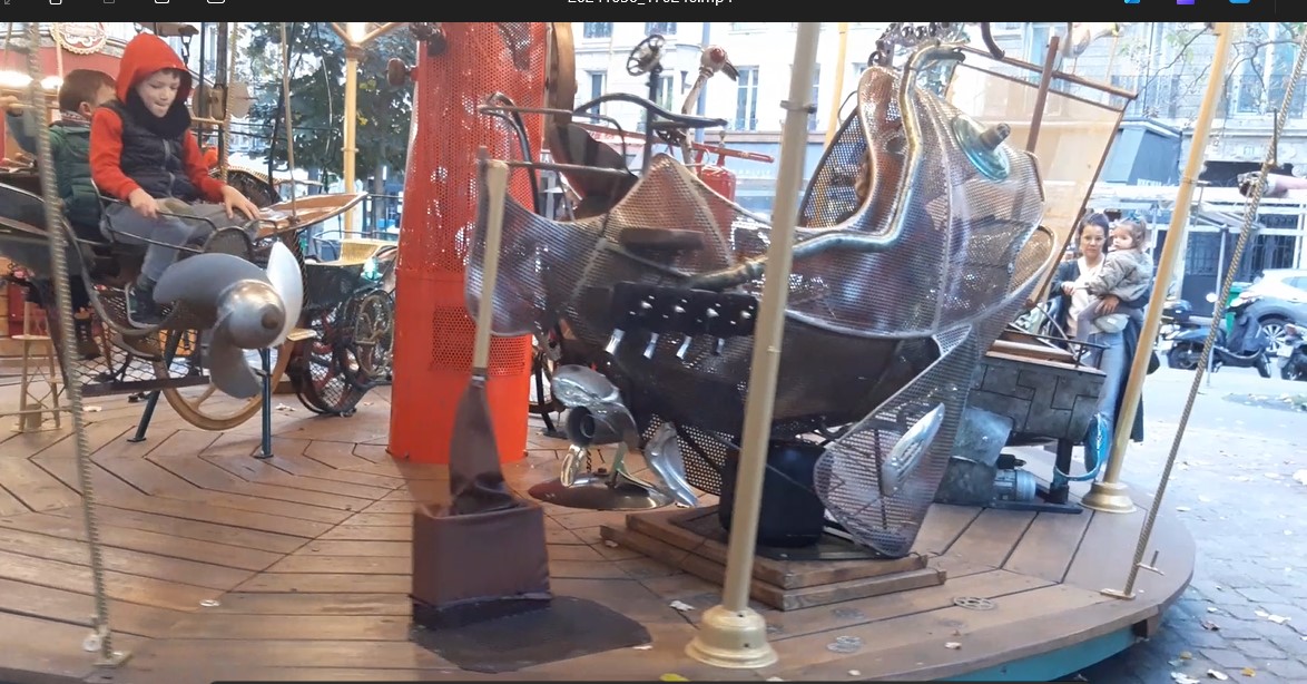 Eigenlijk ben ik in Parijs van ’s morgens vroeg tot in de avond onderweg. Ik zit eens ergens om iets te eten of te drinken; ruim voorhanden! Bezoek tentoonstellingen maar ook wijken waar ik eerder was of nog nooit; er zijn altijd weer nieuwe ontdekkingen. Een parkje, een pleintje in Le Marais met Joodse scholen met herdenkingsplaquettes maar ook met aankondiging dat er elke zaterdagmorgen een kleuterklas is; in het café ernaast staan de lekkernijen en de knuffels al klaar en krijg ik net als de kleuters een lolly aangeboden. De nieuwe vestiging van UNIQLO; die beginnen naast de Internet verkoop met fysieke winkels waar je de stoffen kunt voelen en de kleding kunt passen. Druk! De parken: vijvers met stoelen en banken waar het met het wat frisse herfstweer prettig is om even te zitten lezen en een crèpe te snoepen. In de Luxembourg komt een stoet kinderen voorbij op ezels; stapvoets, ouders lopen mee en zijn druk met fotograferen, een man met een XL stoffer en blik loopt er achteraan om de ezelpoep op te ruimen. De Olympische ringen op verschillende plaatsen waar gespeeld en gefotografeerd wordt. Canal Saint Martin, de Seine-oevers, de ruimte voor de fiets; wandelen van Orsay naar het Petit Palais over een voetgangersbrug en door het stuk van de Tuilerieën en de parken langs de Champs Élysées waar ik nog nooit gelopen had. Winkeltjes in mijn buurt waar ik een waterglas scoorde, tweedehands voor 1,50. Contant graag, met wisselen van een tientje bij een collega winkelier aan de overkant. De draaimolen op het pleintje vlakbij mijn hotel.