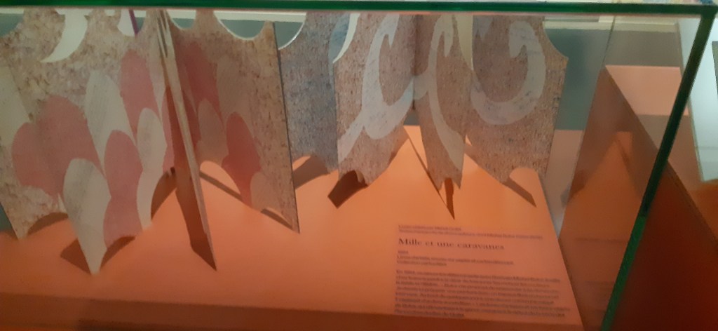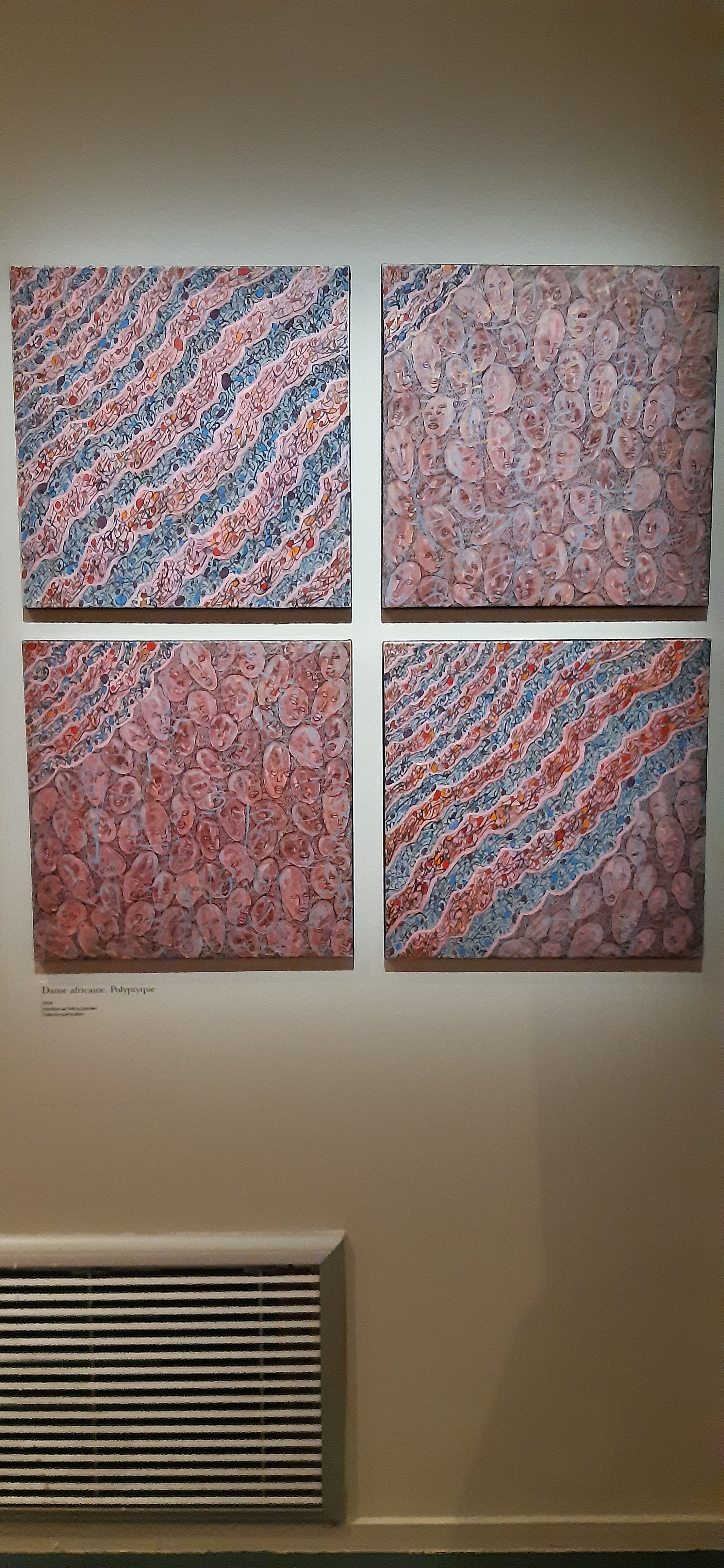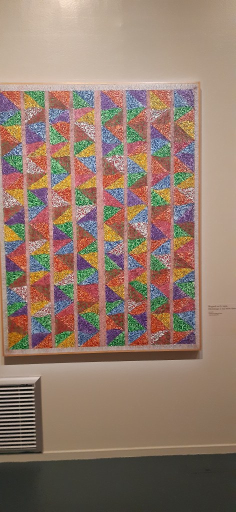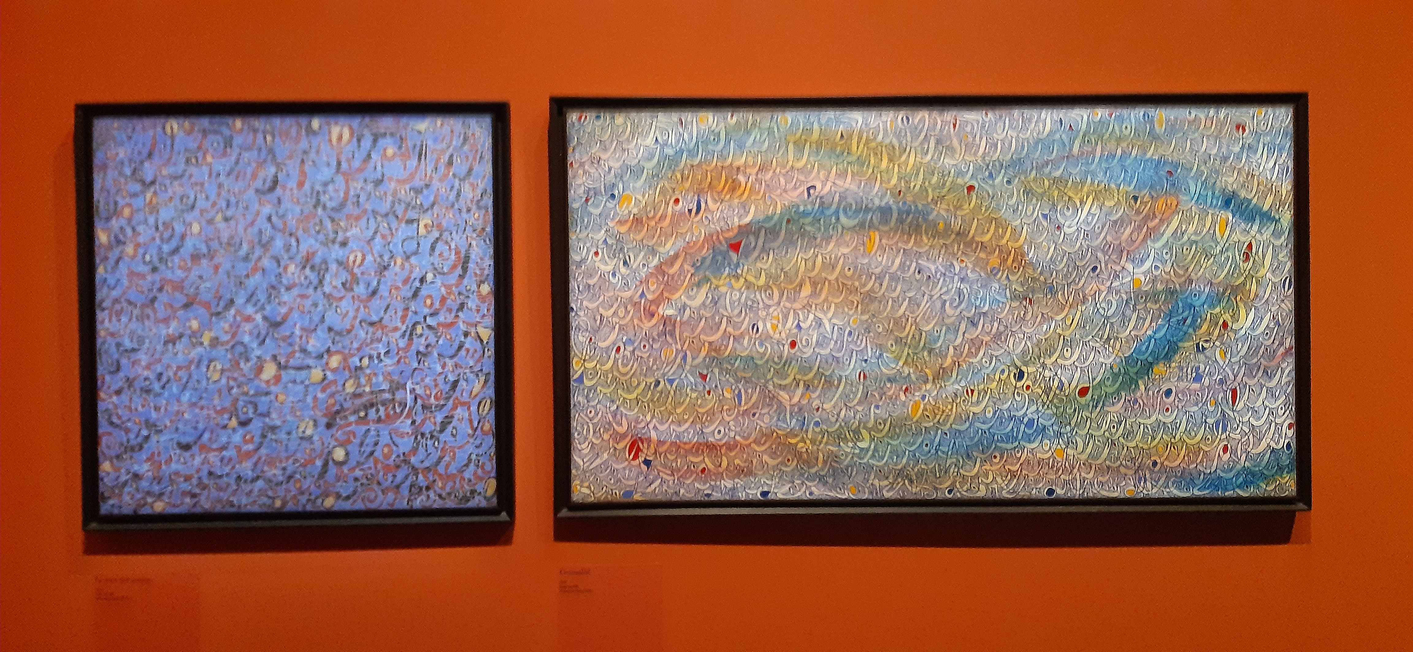 Het Institut du Monde Arabe had ik nog nooit bezocht maar het stond nu op mijn verlanglijstje. Ik boekte vooraf een tijdslot voor een tentoonstelling van Mehdi Qotbi, een Marokkaanse kunstenaar. Bijzonder: Volgens de regels van de Islam mag je mensen en dieren niet afbeelden. Hij maakt een soort schilderijen dat je abstract zou kunnen noemen; kleur en patronen zijn belangrijk , en sommige doeken waren geïnspireerd op de tapijten die hij zijn moeder zag knopen of weven. Met de franje eraan.