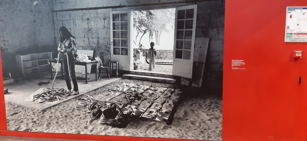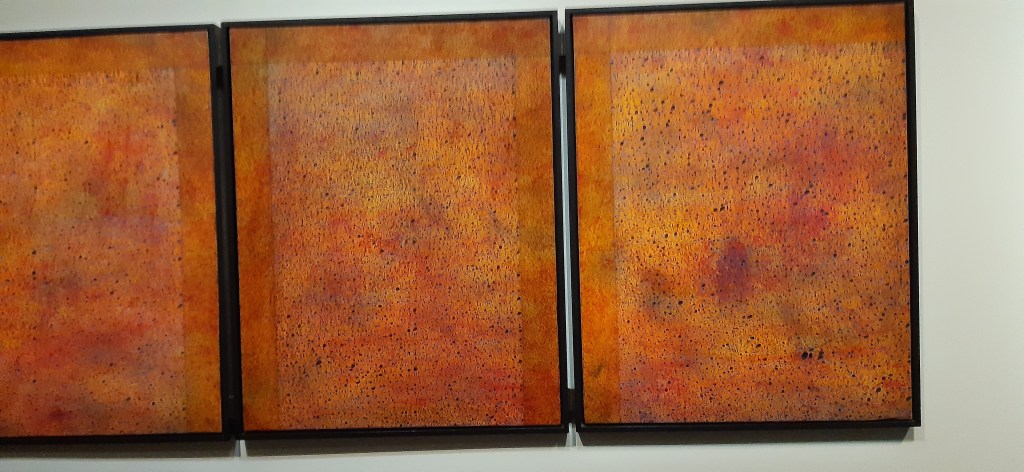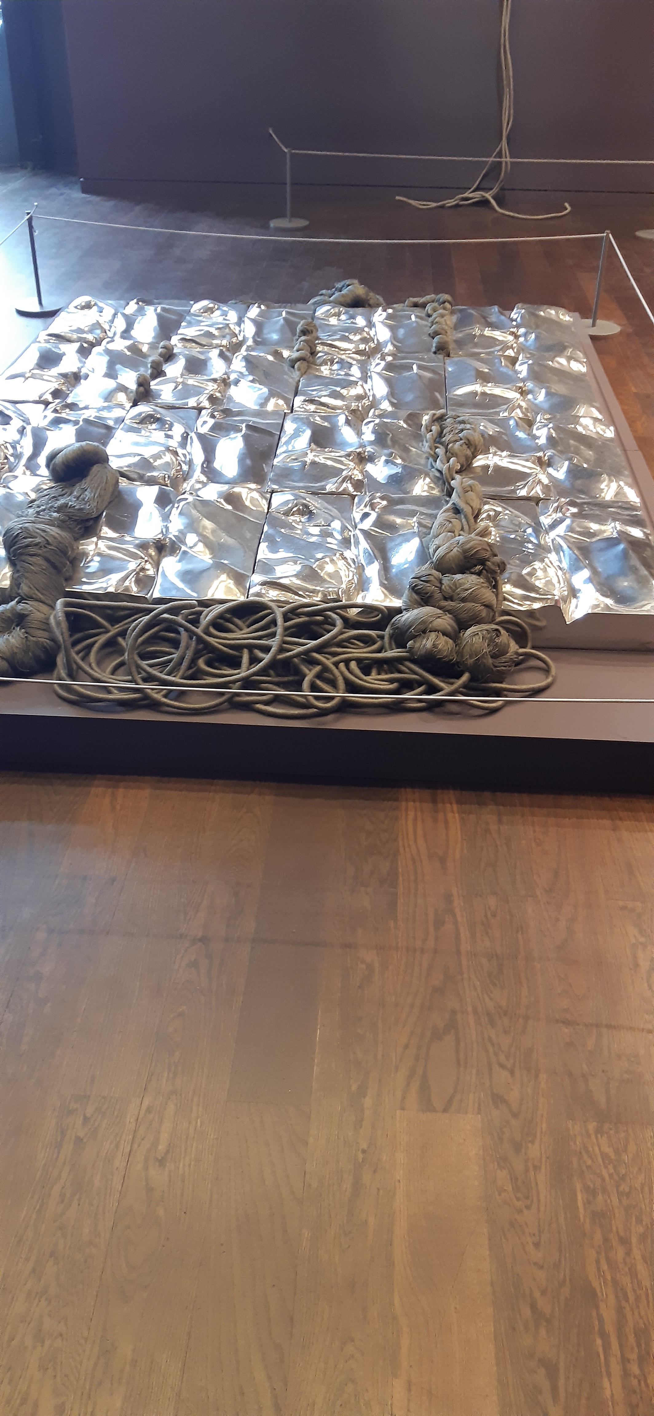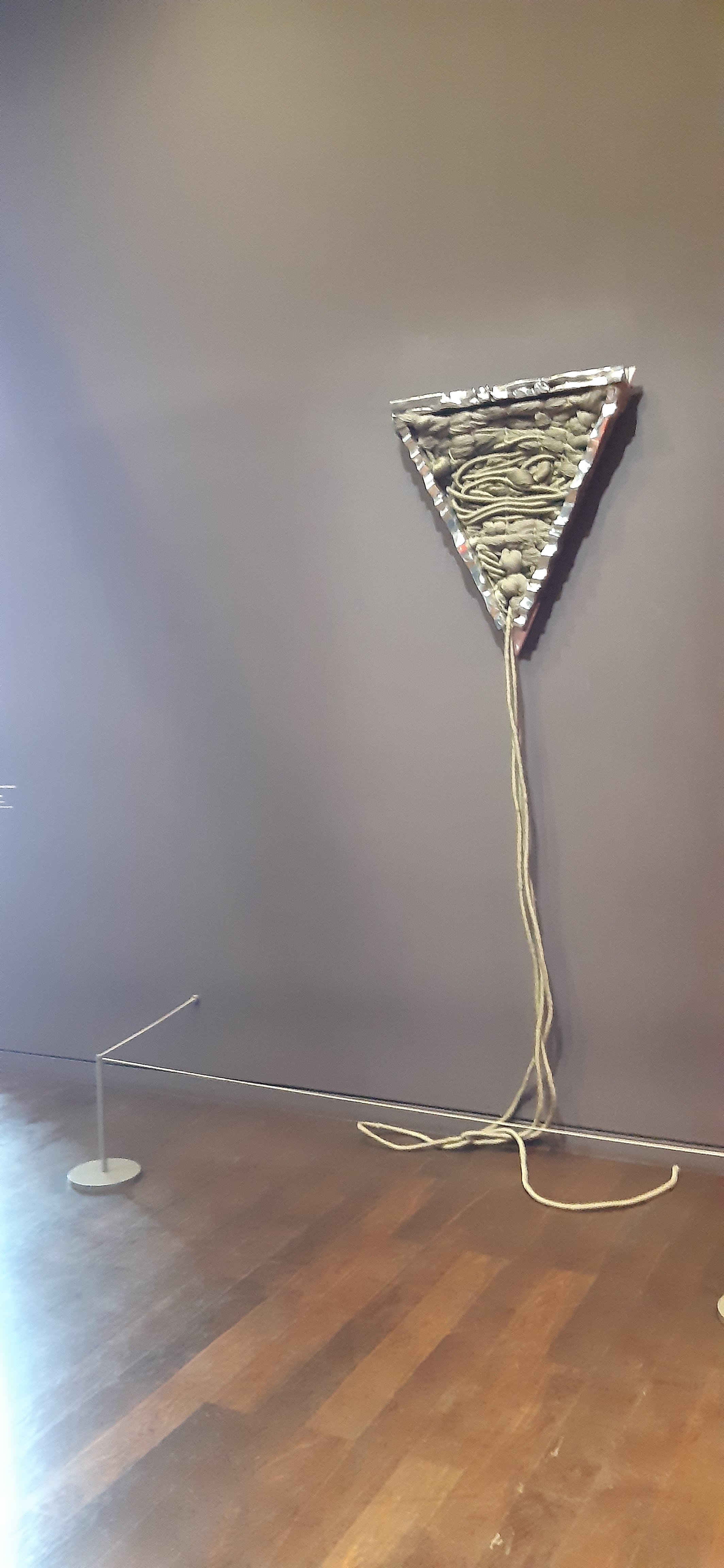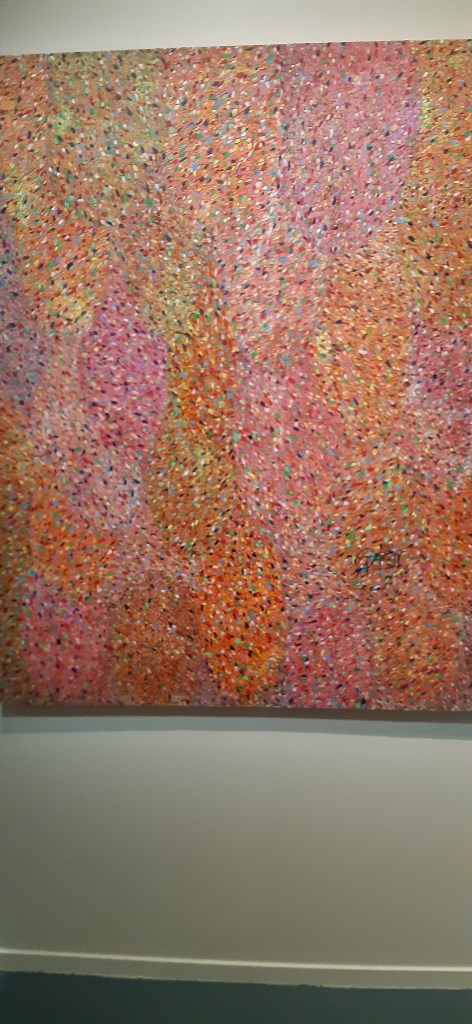 Het Institut du Monde Arabe had ik nog nooit bezocht maar het stond nu op mijn verlanglijstje. Ik boekte vooraf een tijdslot voor een tentoonstelling van Mehdi Qotbi, een Marokkaanse kunstenaar. Bijzonder: Volgens de regels van de Islam mag je mensen en dieren niet afbeelden. Hij maakt een soort schilderijen dat je abstract zou kunnen noemen; kleur en patronen zijn belangrijk , en sommige doeken waren geïnspireerd op de tapijten die hij zijn moeder zag knopen of weven. Met de franje eraan.