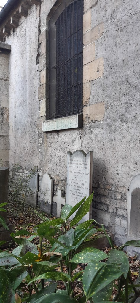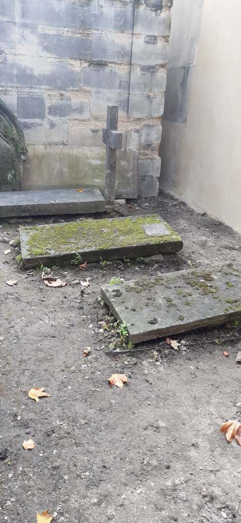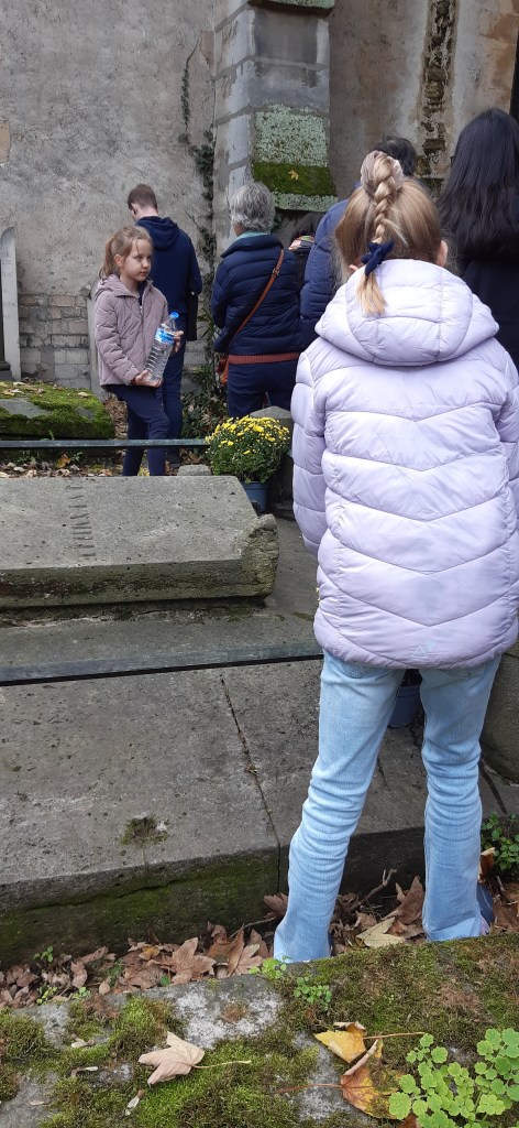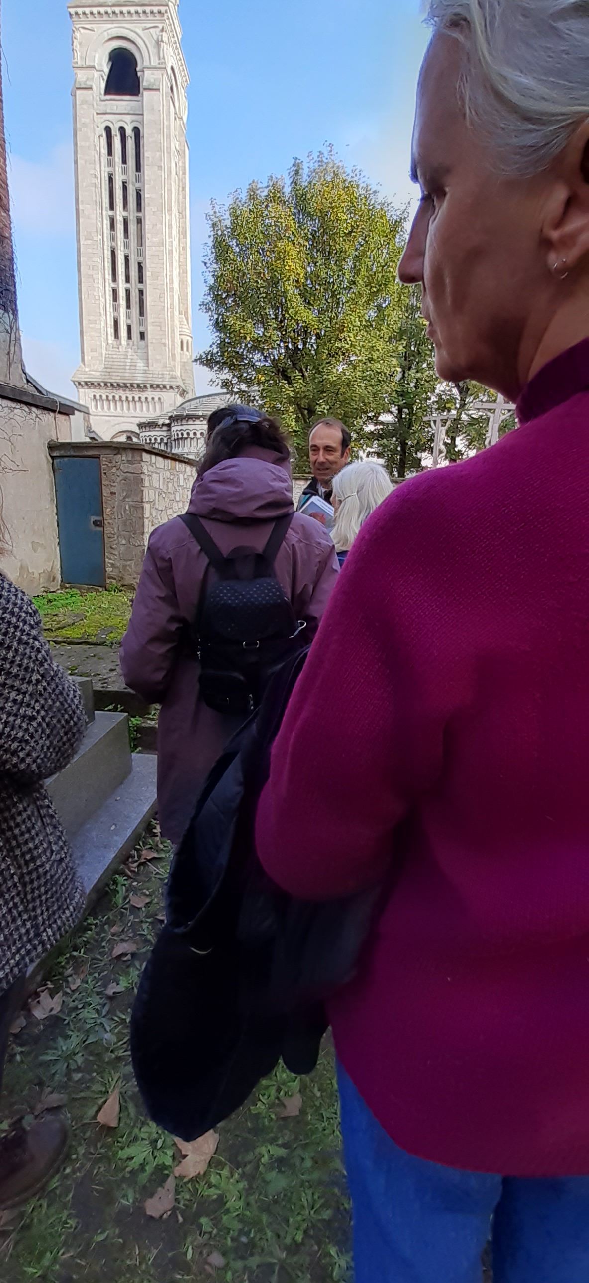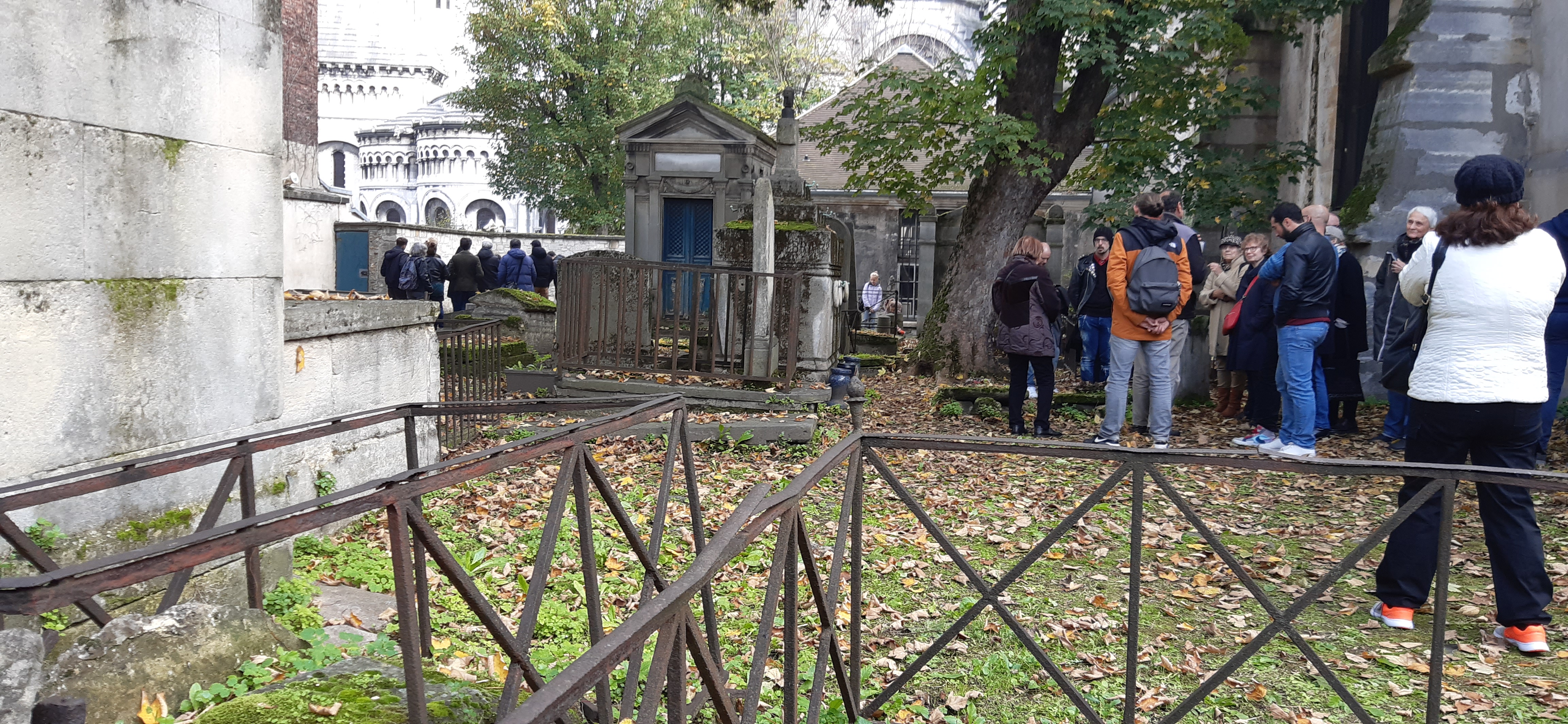 Een Ikje in de NRC bracht me op het spoor: er is een kerkhof in Parijs dat maar 1 dag per jaar open is , en wel op 1 november. Het is gelegen op Montmartre, en het is niet Père Lachaise. 1 November paste in mijn programma dus toog ik naar metrostation Abesses; dat is heel diep gelegen onder de Butte. De trap naar de uitgang telde 181 treden, zo werd aangegeven. Er was ook een lift maar toen was ik al onderweg. Een drukte van belang natuurlijk; even in de kerk gekeken, in optocht de straten door en de trappen op naar Place du Tertre met alle portretschilders en eten en drinken, diagonaal oversteken – en dan de rust op het pleintje voor de kerk waar al een rij stond voor het bezoek aan het kerkhof. Een familie met 2 meisjes liep langs de rij, met chrysanten in de armen. Later zag ik ze nog bezig met het verzorgen van een graf dat ze kennelijk geadopteerd hadden. Om 13.00 ging de poort open. We liepen naar binnen, vergaapten ons aan de besloten ruimte en de bemoste graven – en dan bleken er gidsen te zijn.