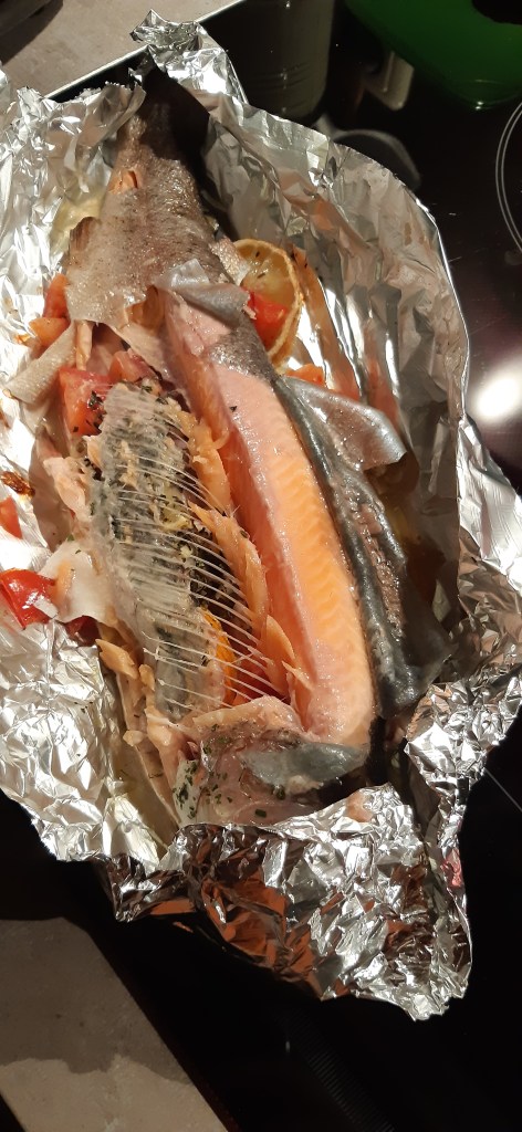 Twee dagen later is het zijn tijd. Bij vrienden had ik mijn honger al gestild dus wat een luxe om die vis uit zijn verpakking te halen, spoelen, drogen, vullen met knoflook, sjalot, tomaat en een geheim kruidenmengsel plus een schijfje citroen, en dan met een scheut olijfolie, peper en zout in een stuk aluminiumfolie verpakken.. half uurtje op 200 graden .. mmm!