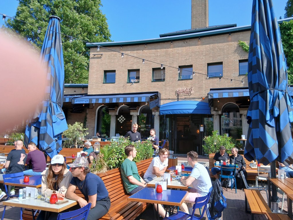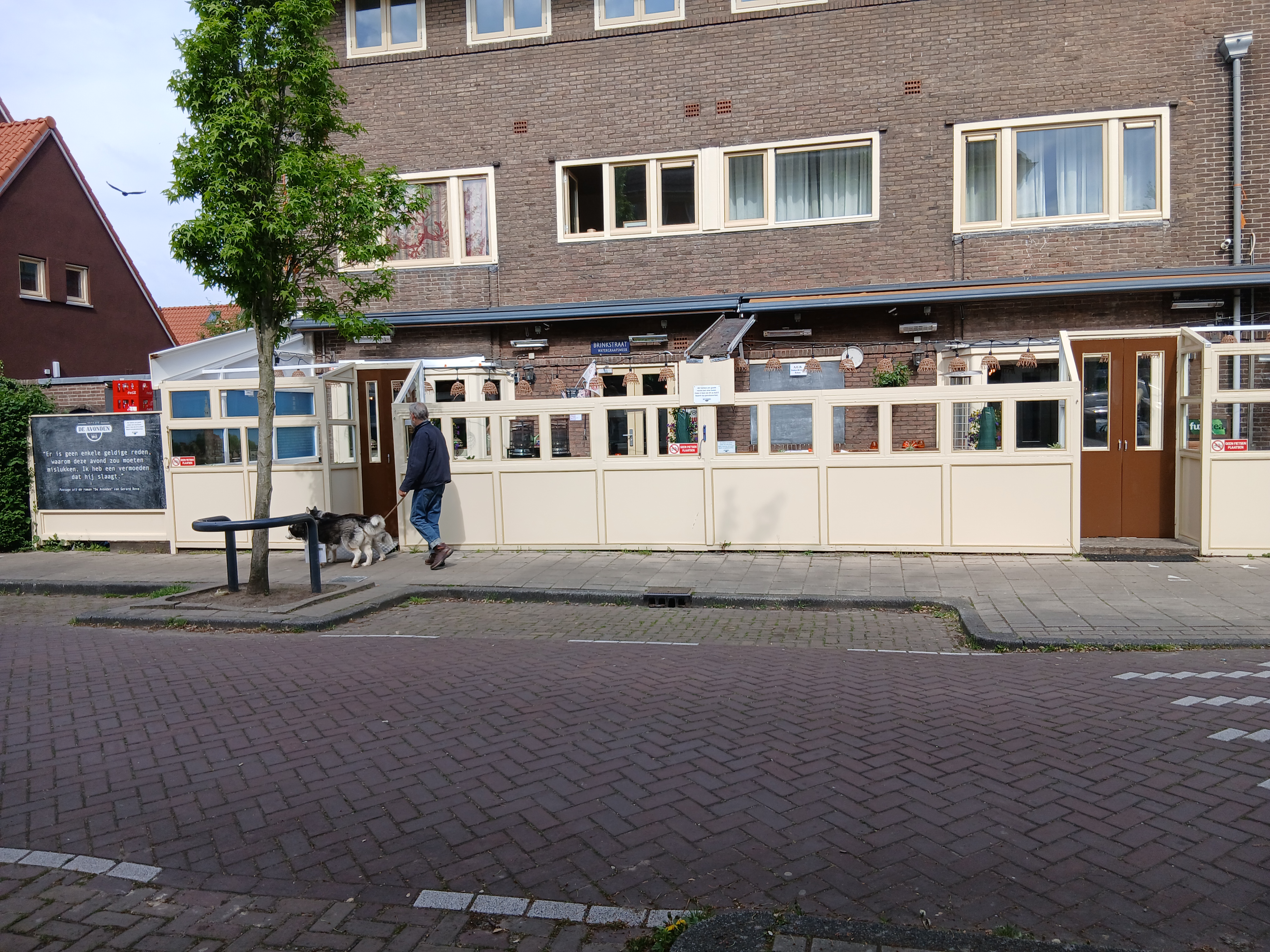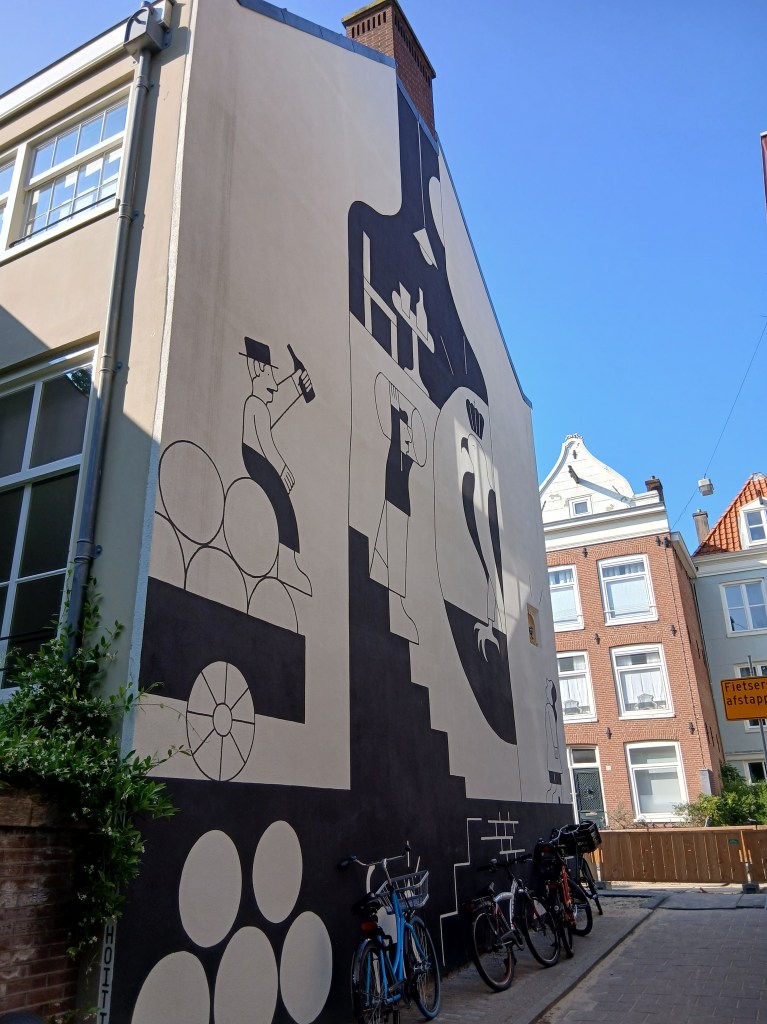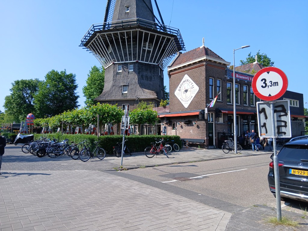 Bij de molen, langs het water, verschillende terrassen; “bestel per QR code”. Ja, ik heb het serieus geprobeerd maar er bleef een oude site om de voorrang vragen. Gelukkig kon ik ook nog gewoon aan de bar terecht voor een IJ wit en een broodje kroket. Prachtig om de ketels te zien waar het spul in wordt gebrouwen – later kom ik nog eens terug op andere ambachtelijke brouwerijen zoals De Snorin Velp. Dan even links – rechts.. een andere kade langs en je loopt op de Hoogte Kadijk. Een stoet pakhuizen, het gebouw van de gemeentelijke elektriciteitscentrale..