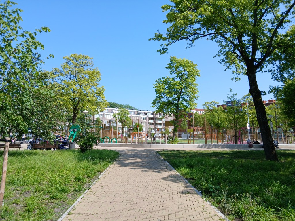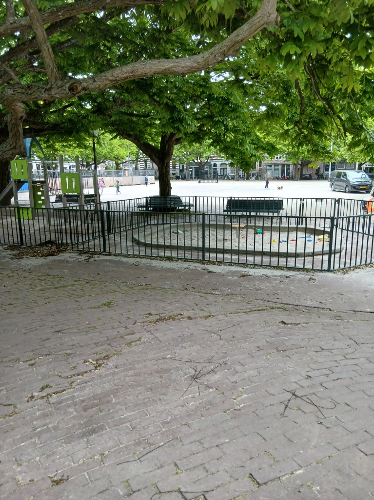 Ook een paar honderd meter verderop een geweldig groen speelterrein (Sumatraplantsoen) waar ouders met kinderen zijn, maar ook grootouders (?? of gewoon ouderen uit de buurt?) hun hangplek hebben gevonden met zelf meegebrachte koffie en thee. Daar, links, achter de bomen..
