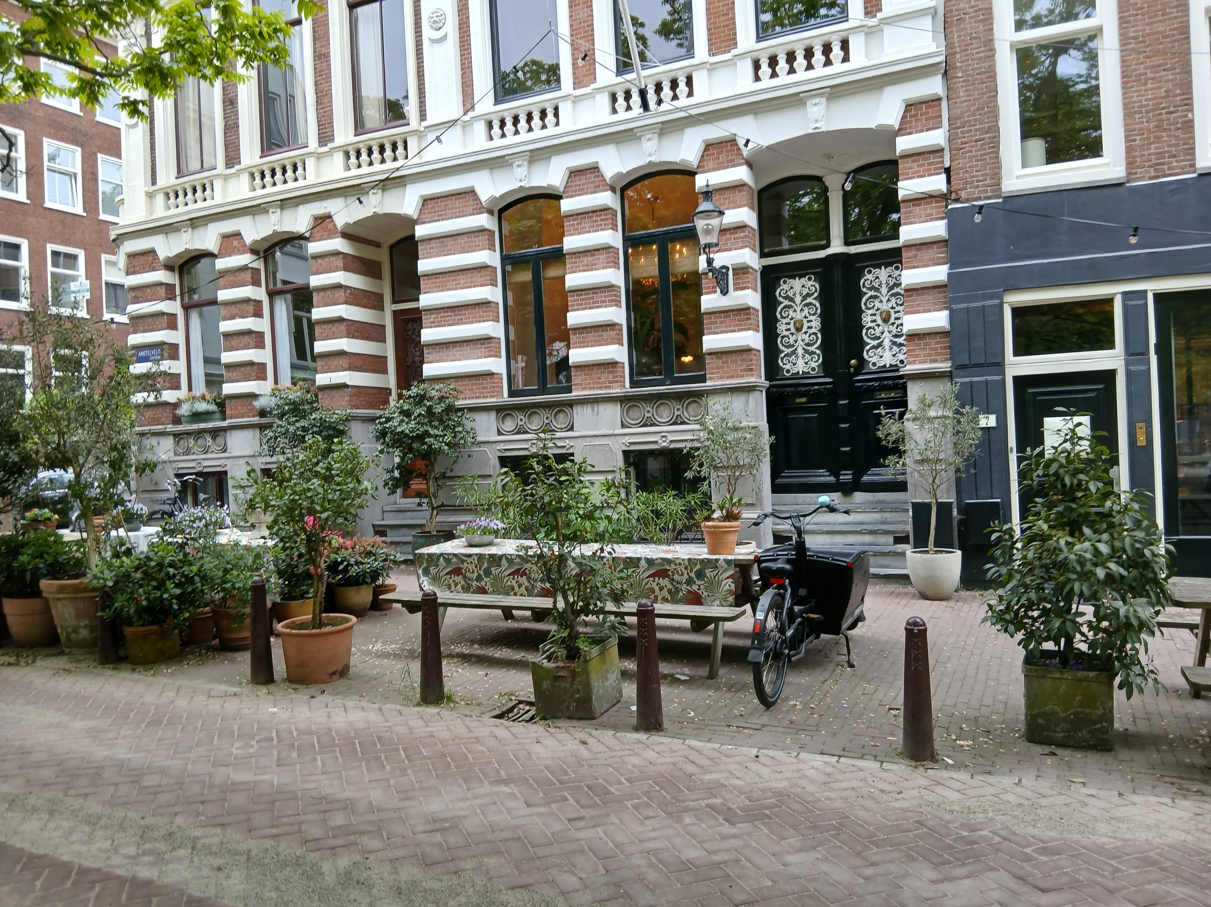 Het Amstelveld is toch wel heel charmant; zo midden in de stad een ruim plein om te spelen, wél met mooie oude bomen, maar aan de buitenkant; de bewoners hebben tafels voor hun huizen gezet en er is een leuk klein café.