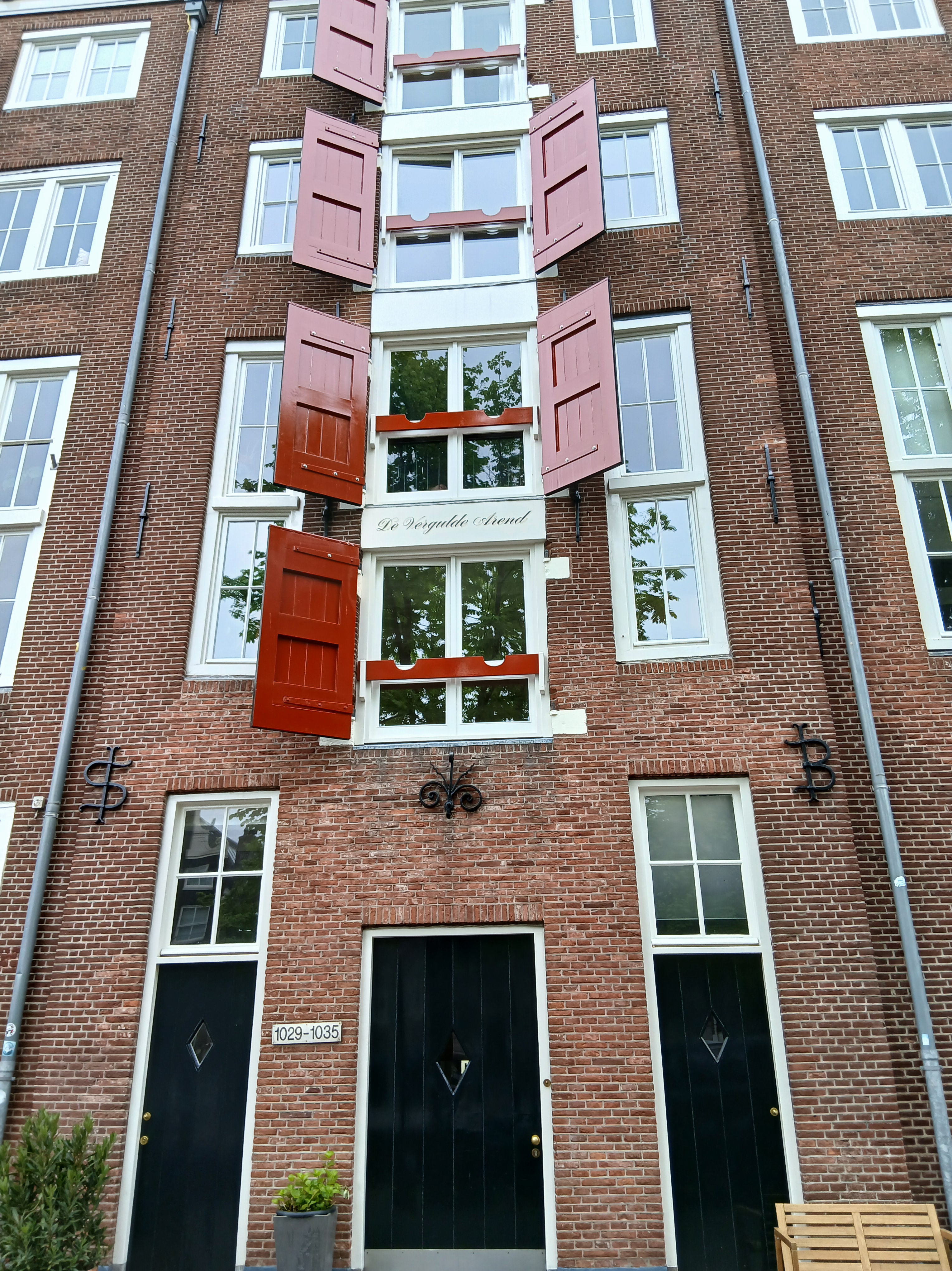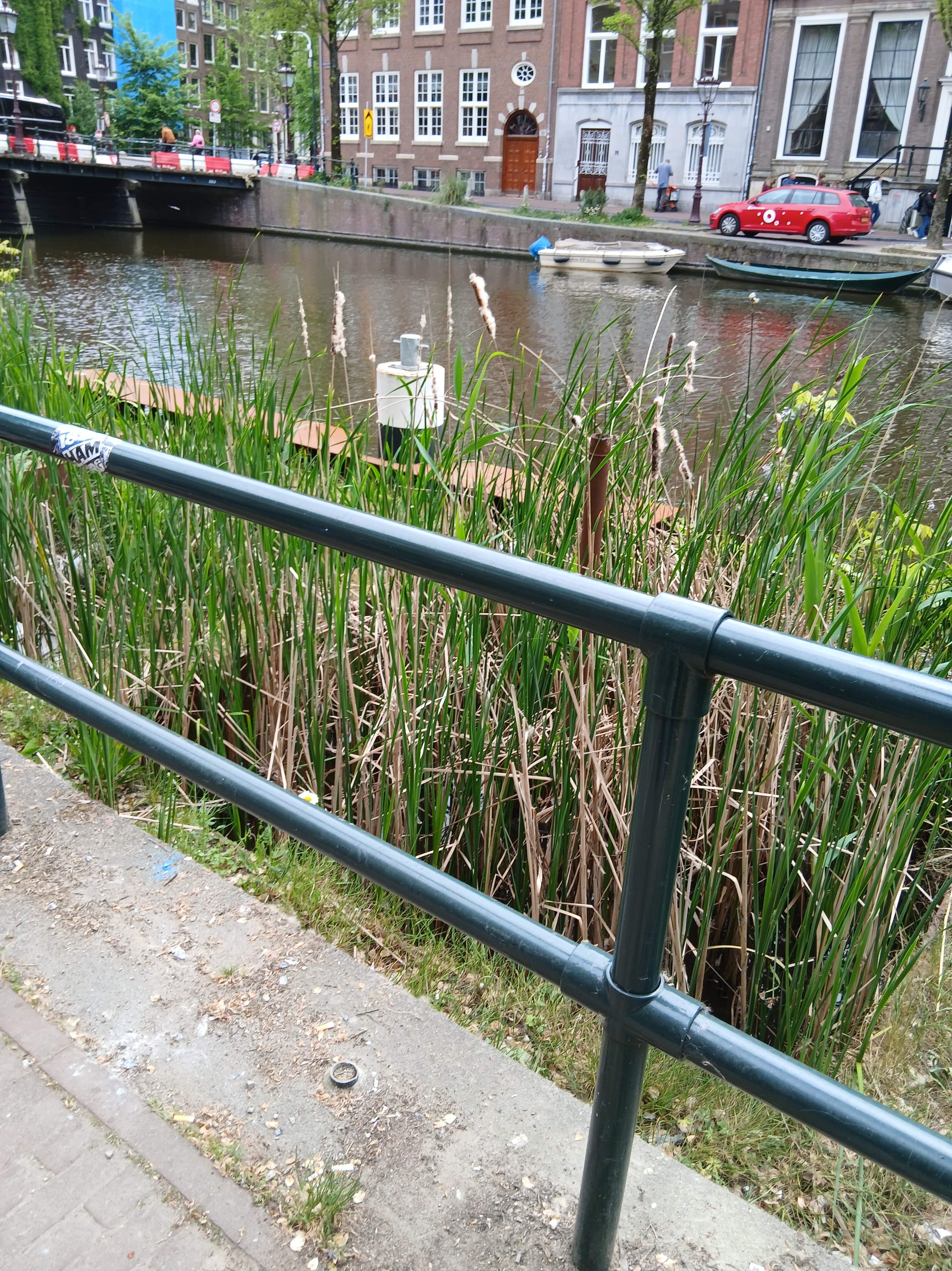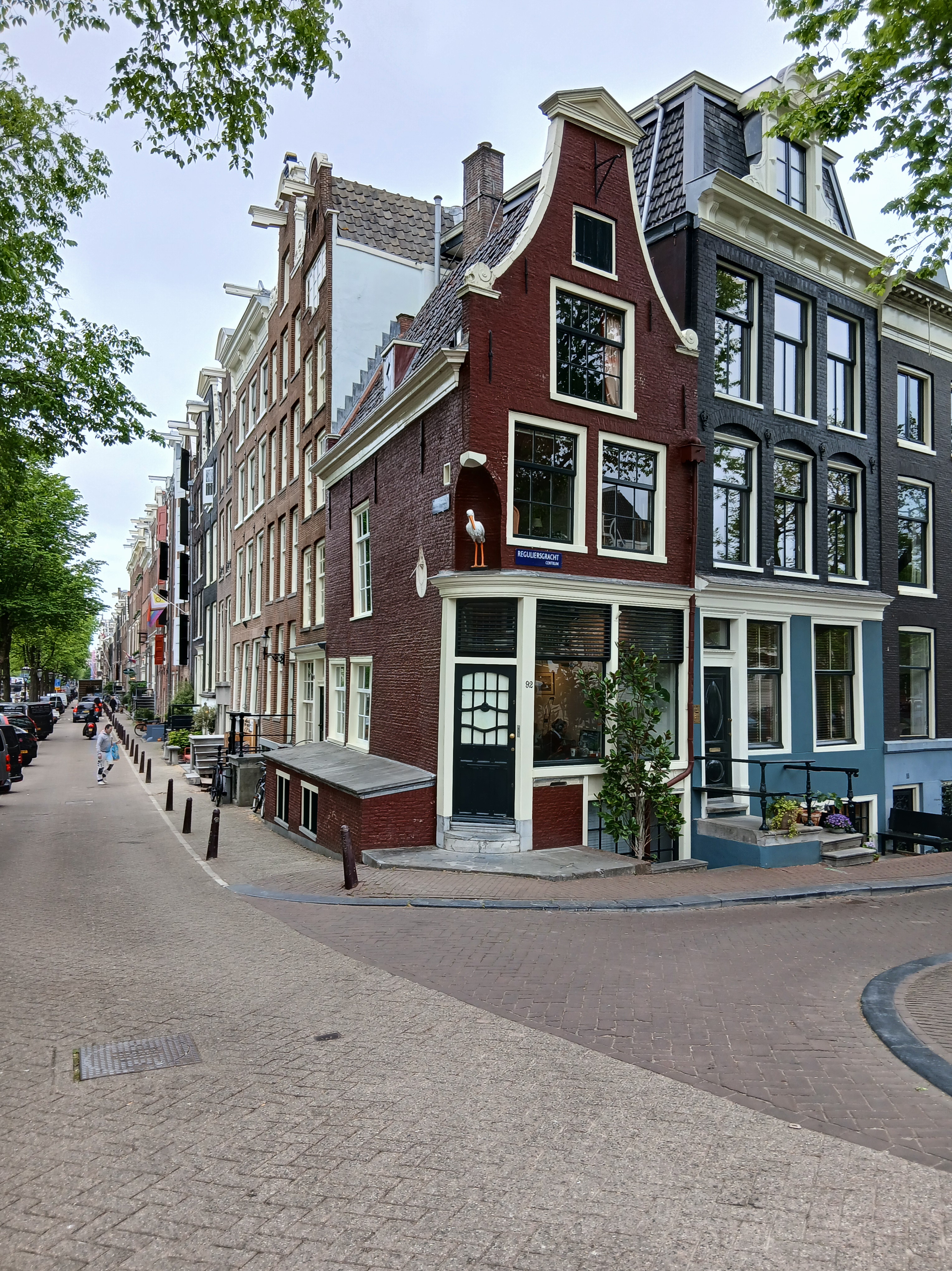 Onderweg tref ik veel bijzondere huizen en objecten: een lantaren op de Blauwbrug, het huis ‘De Vergulde Arend’ met boven de kelder ernaast ‘De Blauwe Arend’; een huis met een ooievaar op de hoek van de Reguliersgracht, een prachtig pand aan de overkant van de Amstel, een vlonder met wilde planten in de Kloveniersburgwal..
