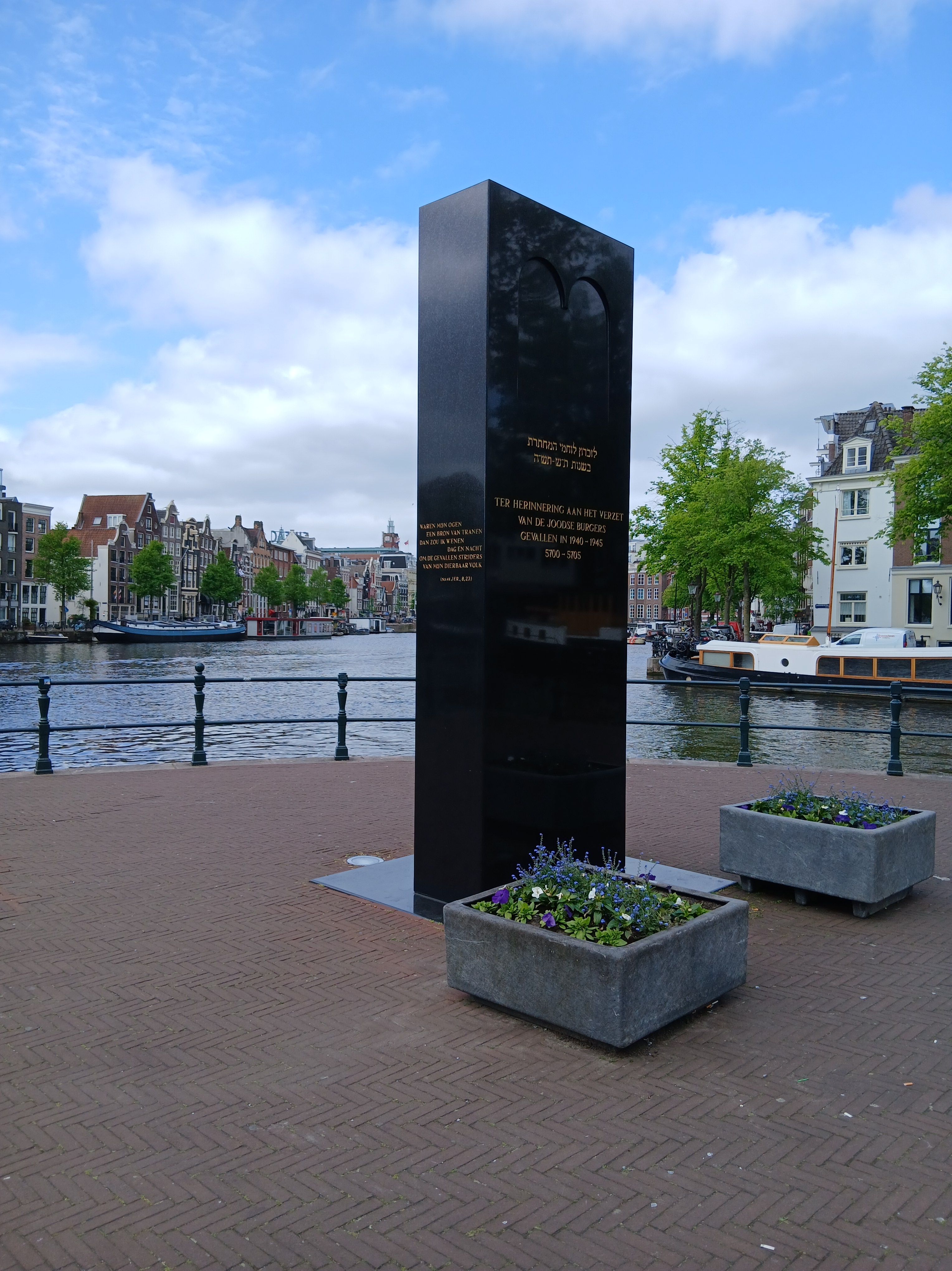 De Schaduwkade. De Dokwerker waar groepen belangstellenden verteld wordt over de betekenis van dit monument. Monument Joods Verzet bij de Stopera; Spinoza op het Waterlooplein, met een tekst die gaat over de Staat die de vrijheid van de burger moet garanderen. Er hangt een burger zodanig over de tekst van het monument dat ik die niet heb kunnen fotograferen.. gelukkig is Spinoza ook online beschikbaar.