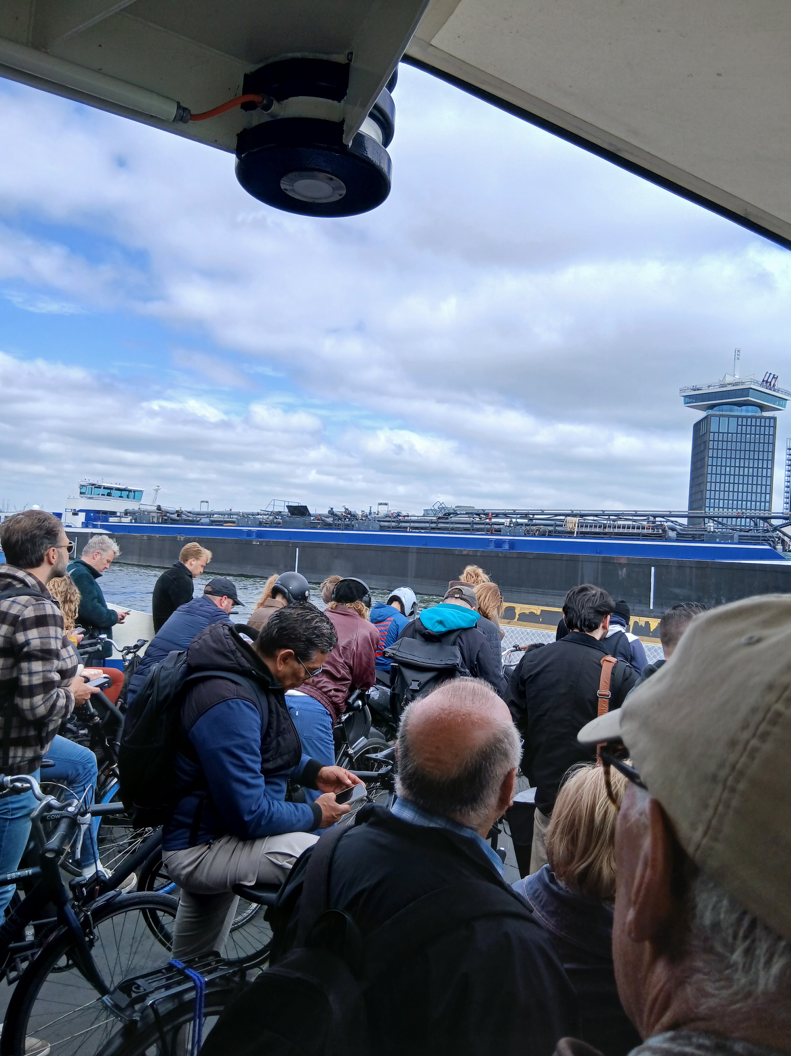 De pont over het IJ is altijd fijn; even uitwaaien en een andere wereld in. Er vaart eerst even een tankschip voorbij.