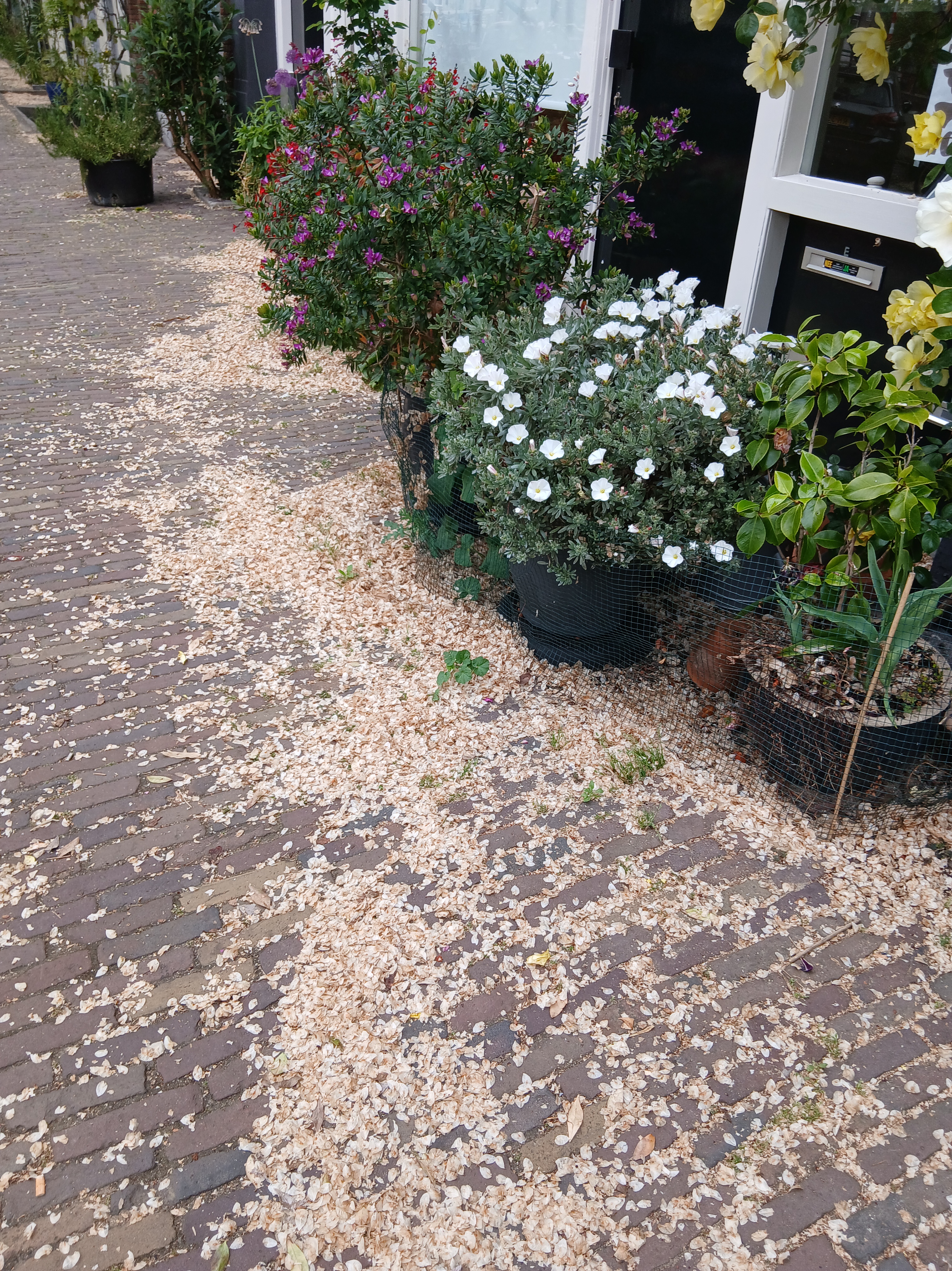 Deze keer ging ik voor de Springsnow wandeling: ter gelegenheid van het uitvallen van de iepen is er een wandeling uitgeschreven om dit verschijnsel te bestuderen. Het Springsnow Festival begint al op 21 april – maar toen was er nog helemaal geen spoor van iepensneeuw, dus ik heb even een paar weken gewacht. En ja, nu is het er! Dé test: het halletje achter de voordeur in het appartementencomplex van mijn zoon. Daar staan iepen voor de deur, en het sneeuwt nu op de stoep, en je loopt het naar binnen in het halletje.