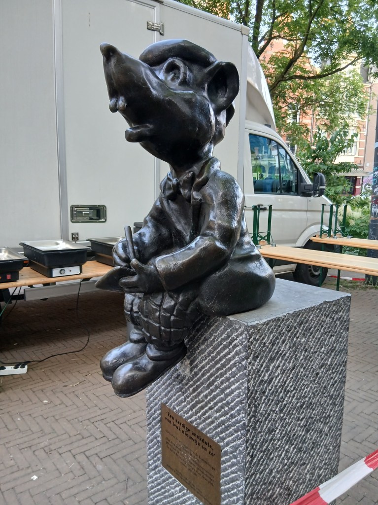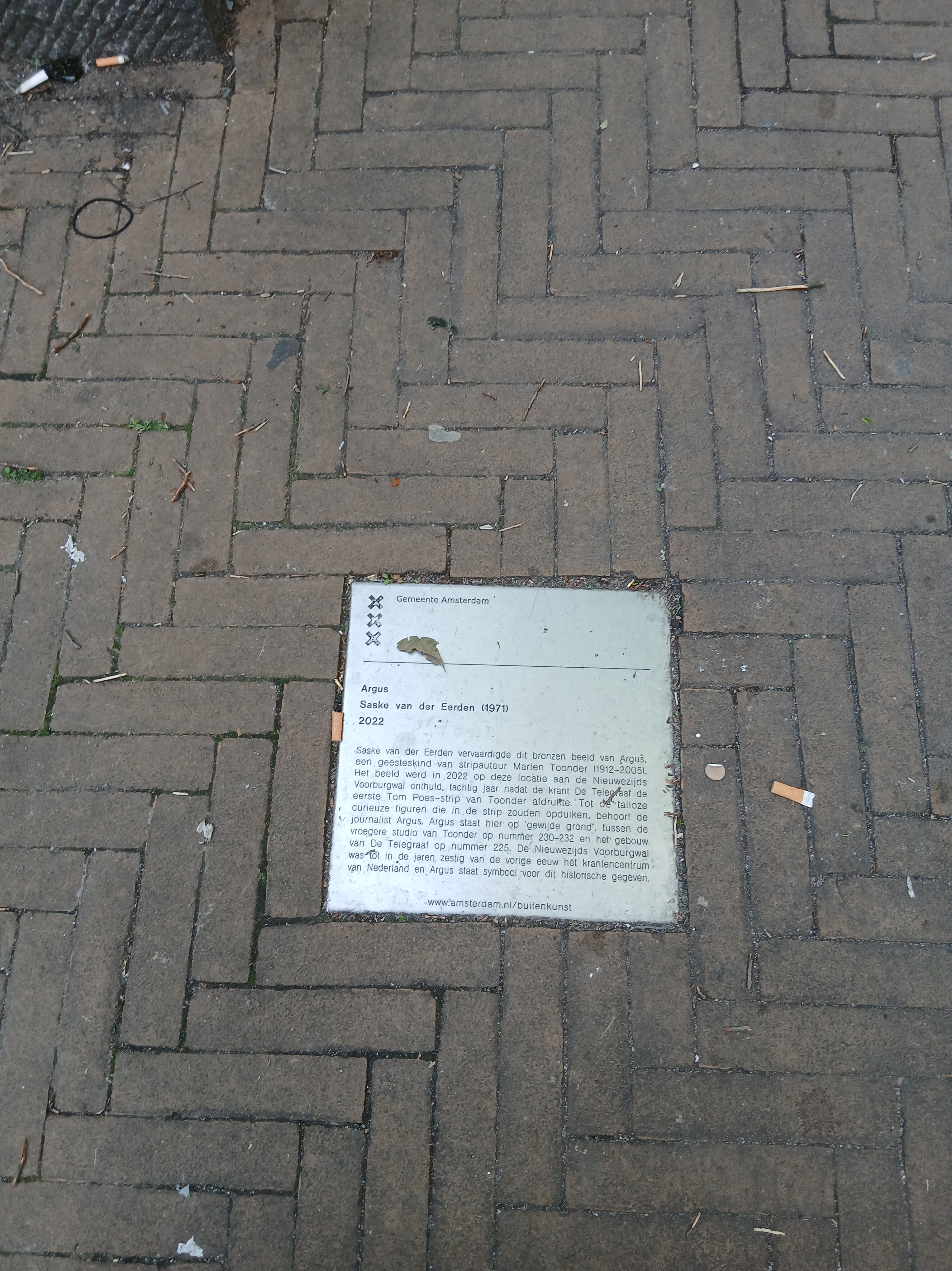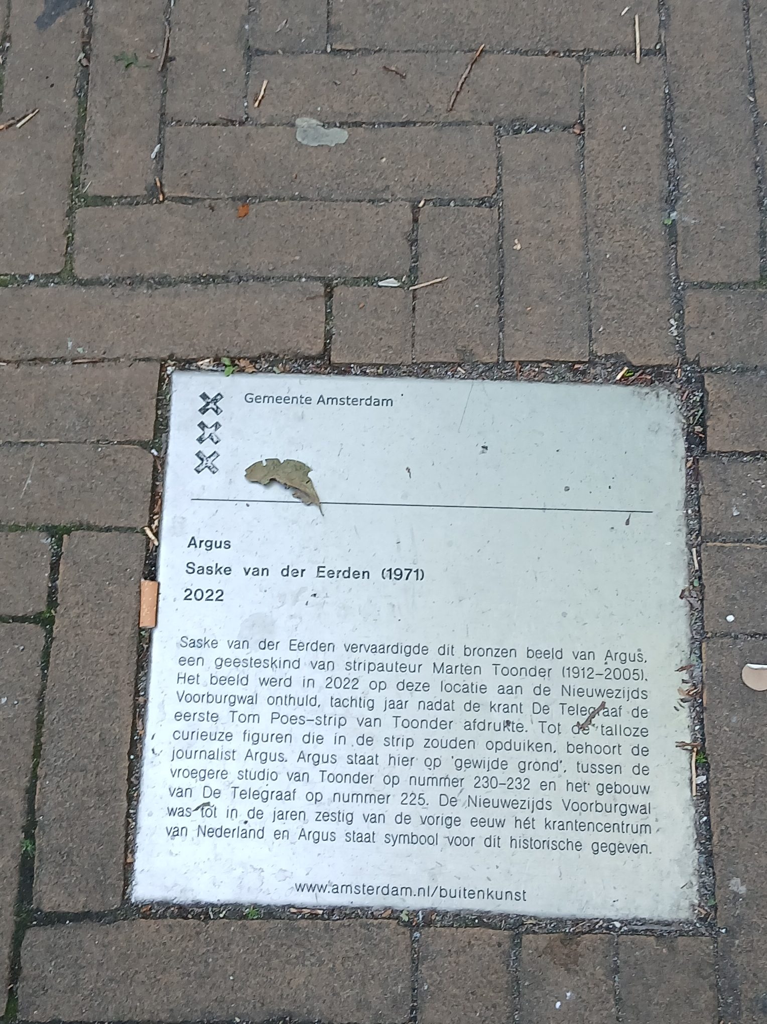 Ik ben te vroeg (het begint om 21.30) dus ik maak nog even gebruik van een van de banken die daar ruim voorhanden zijn. Met uitzicht op een beeldje. Wie is dat nou? Argus! De journalist uit de Bommel strips staat hier toepasselijk tussen de voormalige redactie van de Telegraaf en de studio van Toonder.
