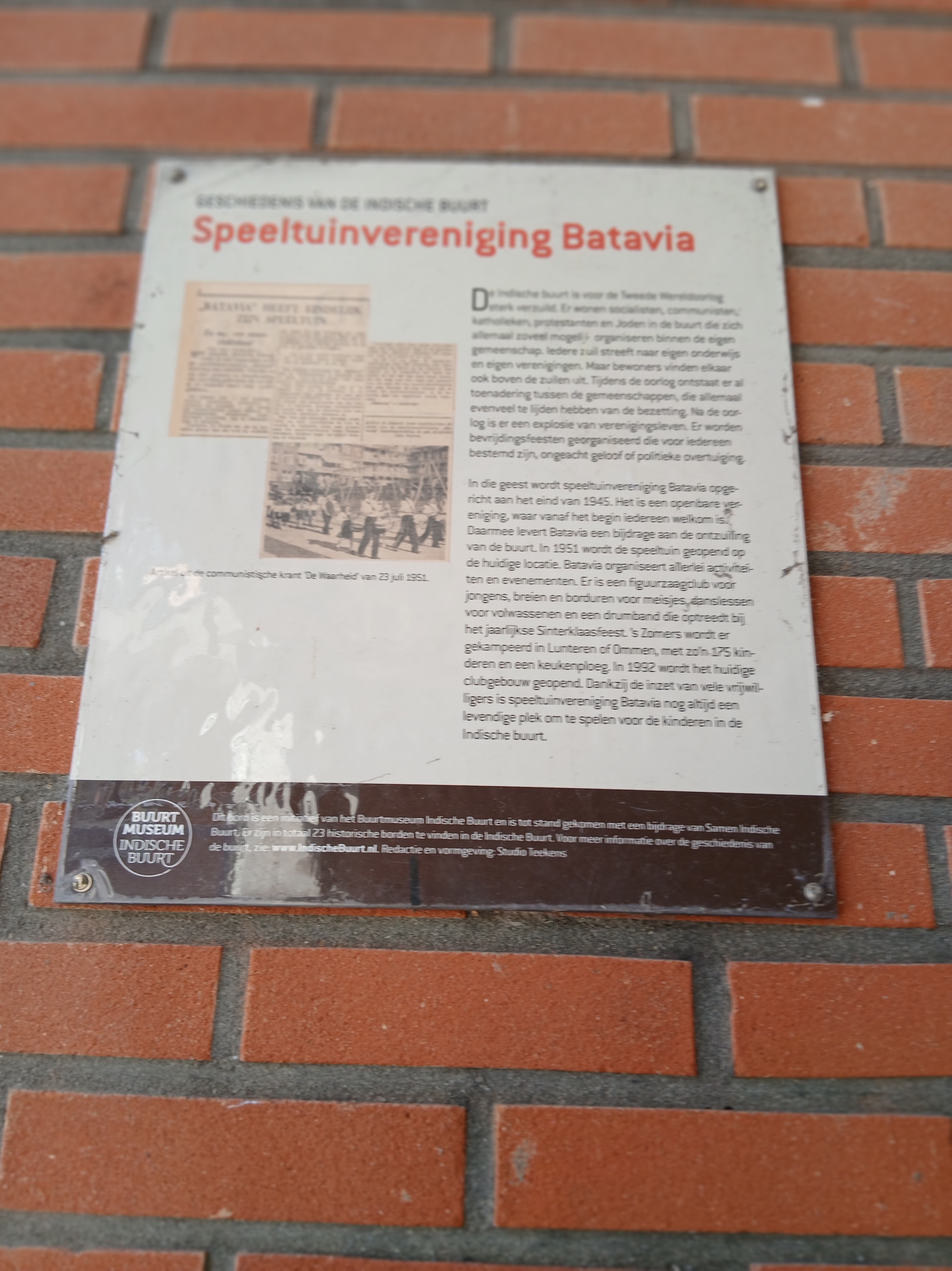 En zo nam ik de tram naar het Muiderpoortstation want dan loop je zo de Indische Buurt in. Het is een buurt met een oude geschiedenis maar met vooral veel jonge huizen. Hier en daar een blokje oud. De geschiedenis is er wel: de speeltuin Batavia is al heel oud. Ontstaan toen in de Indische Buurt nog veel verschillende groeperingen verzuild naast elkaar woonden maar er gewoon behoefte was aan een gezamenlijke speelgelegenheid. En ja, die floreert nog steeds!