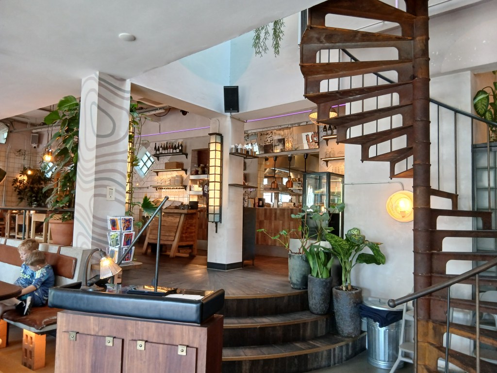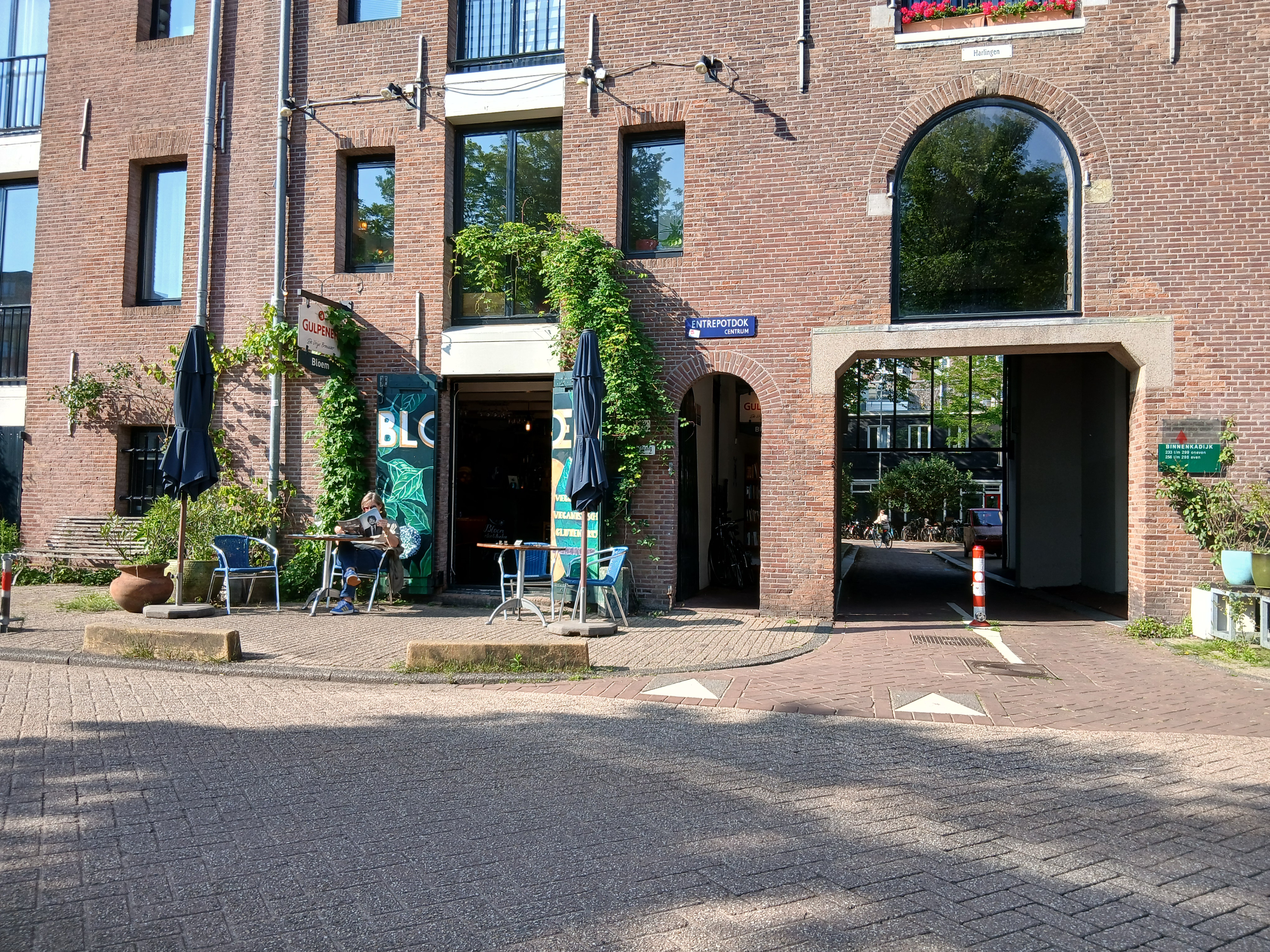 De Hoogte Kadijk, de Laagte Kadijk.. alles even comfortabel, groen, oude gerestaureerde gebouwen met alle bijbehorende charmante details. Natuurlijk wordt ook hier aan de straat gewerkt maar ik kan er makkelijk tussendoor banjeren om van de Hoogte Kadijk naar de Laagte Kadijk te gaan, en dan uiteindelijk het Entrepotdok. Als er iets fancy is, dan dit! Een oud gebouw, voormalige pakhuizen, aan het water waar gesupt wordt, veel ruimte voor fietsen en wandelen, – ik val voor Bloem, een horecagelegenheid die daar precies past. Mooie binnenruimte, fijne zit aan het water, vegan.. en ik zie de buurt voorbijkomen. Maar ja, is ook mijn bubble, toch?