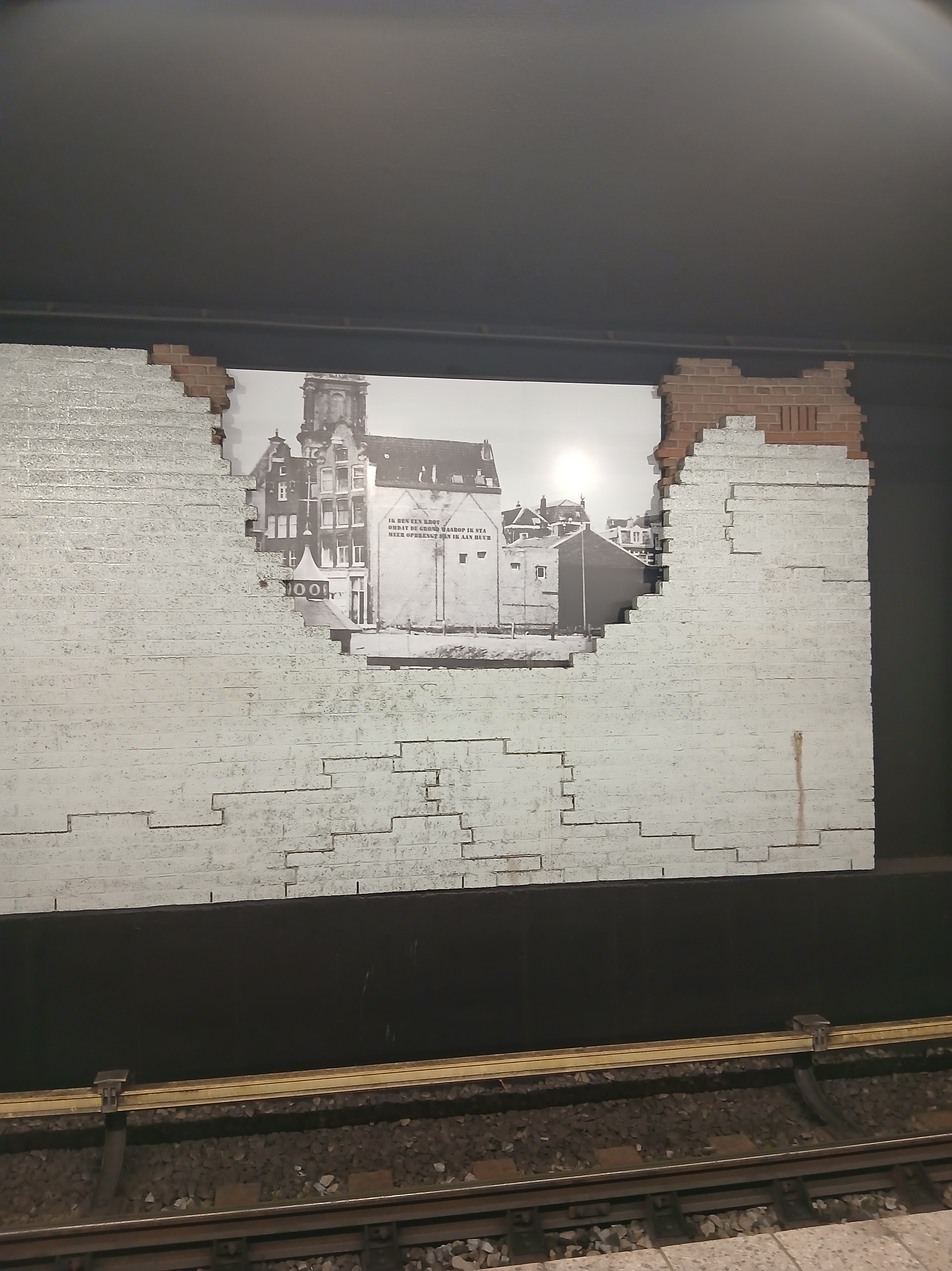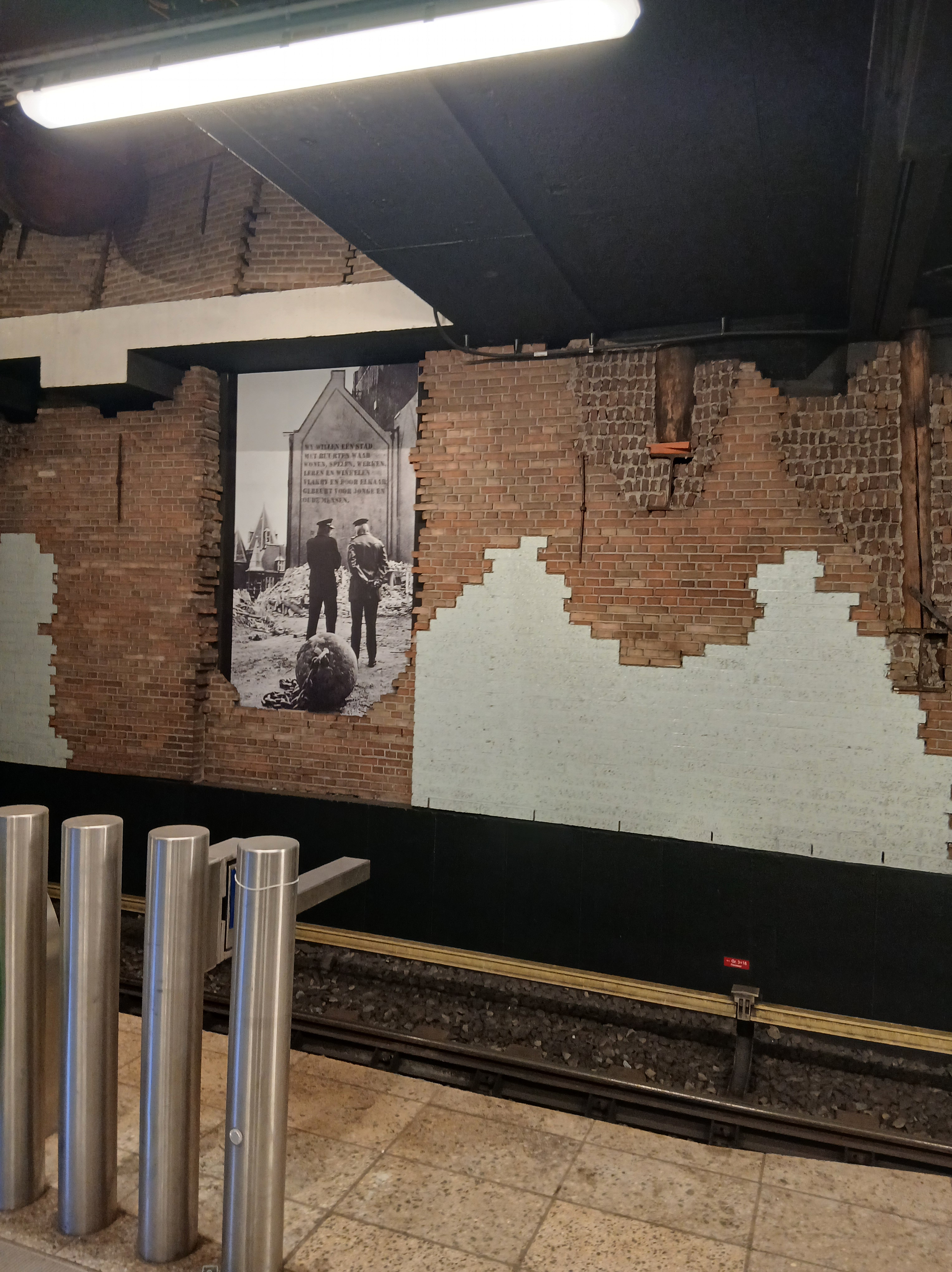 Toen ik een paar weken geleden voor het eerst op station Nieuwmarkt uitstapte zag ik in dat station de gedenktekens aan de strijd om de wijk: vrienden van mij woonden daar ooit in een kraakpand en kregen een woning aangeboden als onderdeel van het proces van verandering: de aanleg van de metro. Dat proces ging gepaard met lichtelijk gewelddadige actie. De tijd van Geen woning Geen kroning. Op Station Nieuwmarkt zijn de beelden nog te zien. Tussen de sloop-muren: de foto’s van toen. Met de teksten.