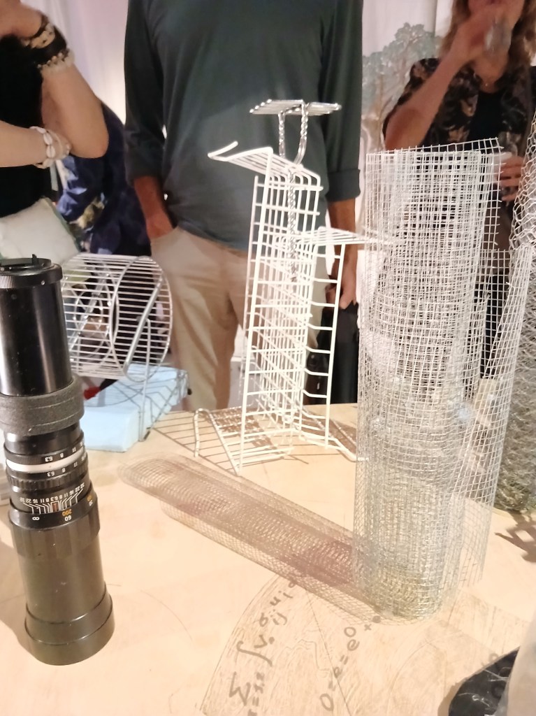 De volgende dag nam ik deel aan de afdeling Beeldend voor het programma Onderweg. Muziek maakte muziek, Dans bereidde zich voor op dansen en wij maakten 2D objecten – alles voor een schimmenspel als het donker zou zijn. Het allerlaatste programma onderdeel van deze Buitenkunst week. Publiek én orkest waren buiten, en dansers en wij als Beeldend traden op in de grote tent. Schimmen geprojecteerd op de wand, dansers en dragers onderweg in een lange optocht. Koffers, een vogelkooi aan een stok, een sousafoon, een knapzak, een amfoor om op je hoofd te dragen. Twee emmertjes water aan een draagstok, een kamerplant op een kruiwagen, een berg koffers op een kar. En wat ik aanleverde:
