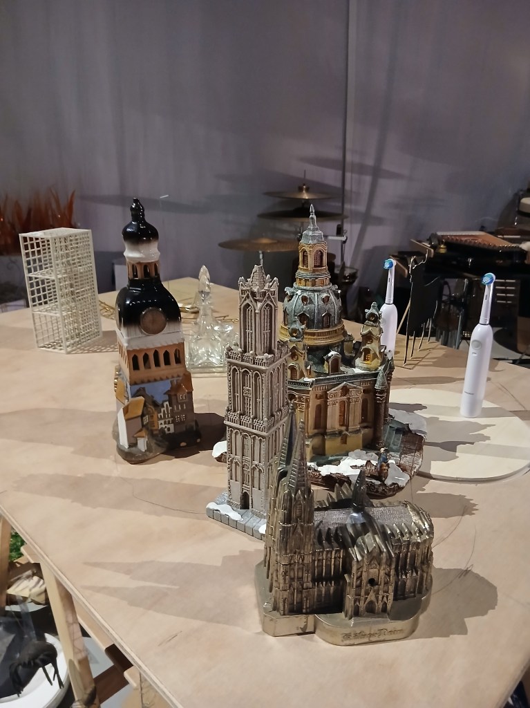 Rond de grote klok staat altijd een rij om op de foto te gaan; daar omheen was een kleine tentoonstelling van mooi nieuw werk, waarvoor weinig belangstelling was.