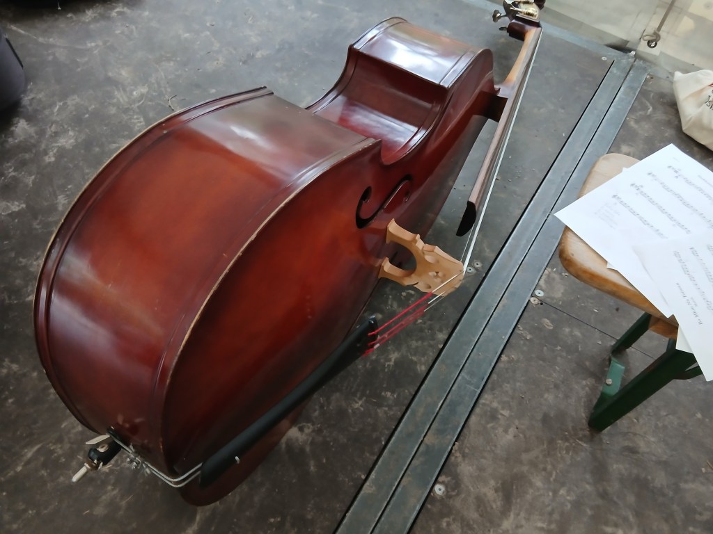Zoals gebruikelijk had ik mijn viool mee want er is altijd wel wat te spelen. Maar deze keer had ik ook mijn zinnen gezet op de contrabas. Zo’n ultra versie van de viool – en op Buitenkunst is er in principe de vrijheid om er eens een te proberen.