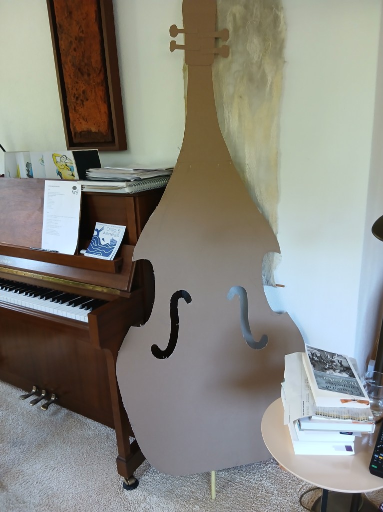 De kartonnen platte contrabas natuurlijk! Die nu bij mij thuis staat. Als fijn aandenken aan een geweldige week Buitenkunst.
