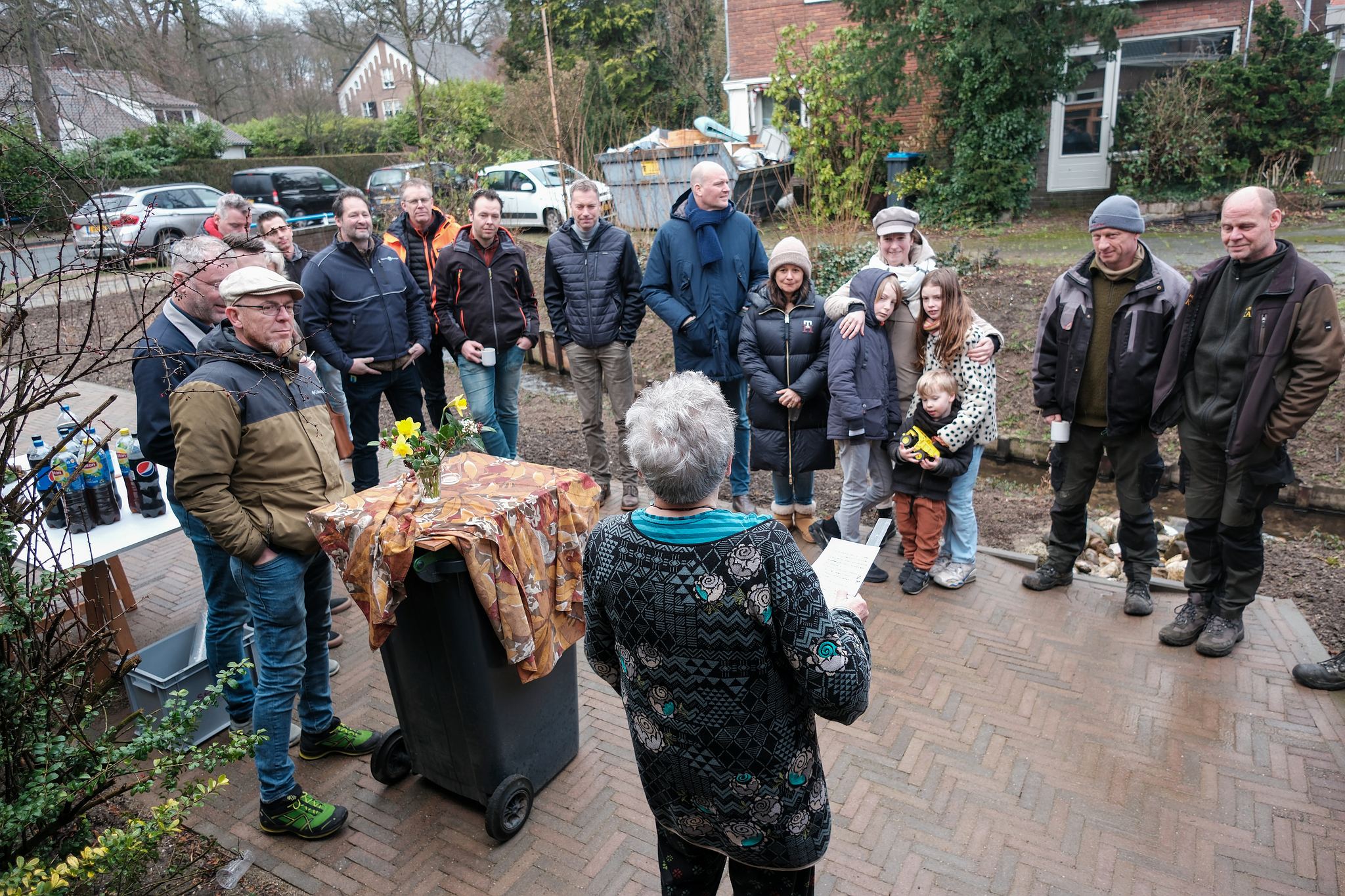 Alles ging in zo goede harmonie en aandacht voor de belangen van de bewoner, dat ik het voorstel deed om de afronding van het project te vieren met een klein feestje waar alle werkers de gelegenheid hadden om het eindresultaat te bewonderen én – in de vorm van een fotopresentatie – het ontstaansproces, en elkaar te ontmoeten. Zo was er op vrijdag 24 februari een evenement met prima catering van Meneer Pos, de nieuwe naam van het vanouds bekende hotel/terras aan de rotonde Rozendaalselaan / Ringallee. De kinderen deden een openingshandeling, een trompetter maakte muziek, en Heemraad Frank Wissink van het Waterschap benoemde in zijn toespraakje het belang van goede samenwerking. Een mooi resultaat waar alle partijen voordeel van hebben. Je moet natuurlijk wel even durven…