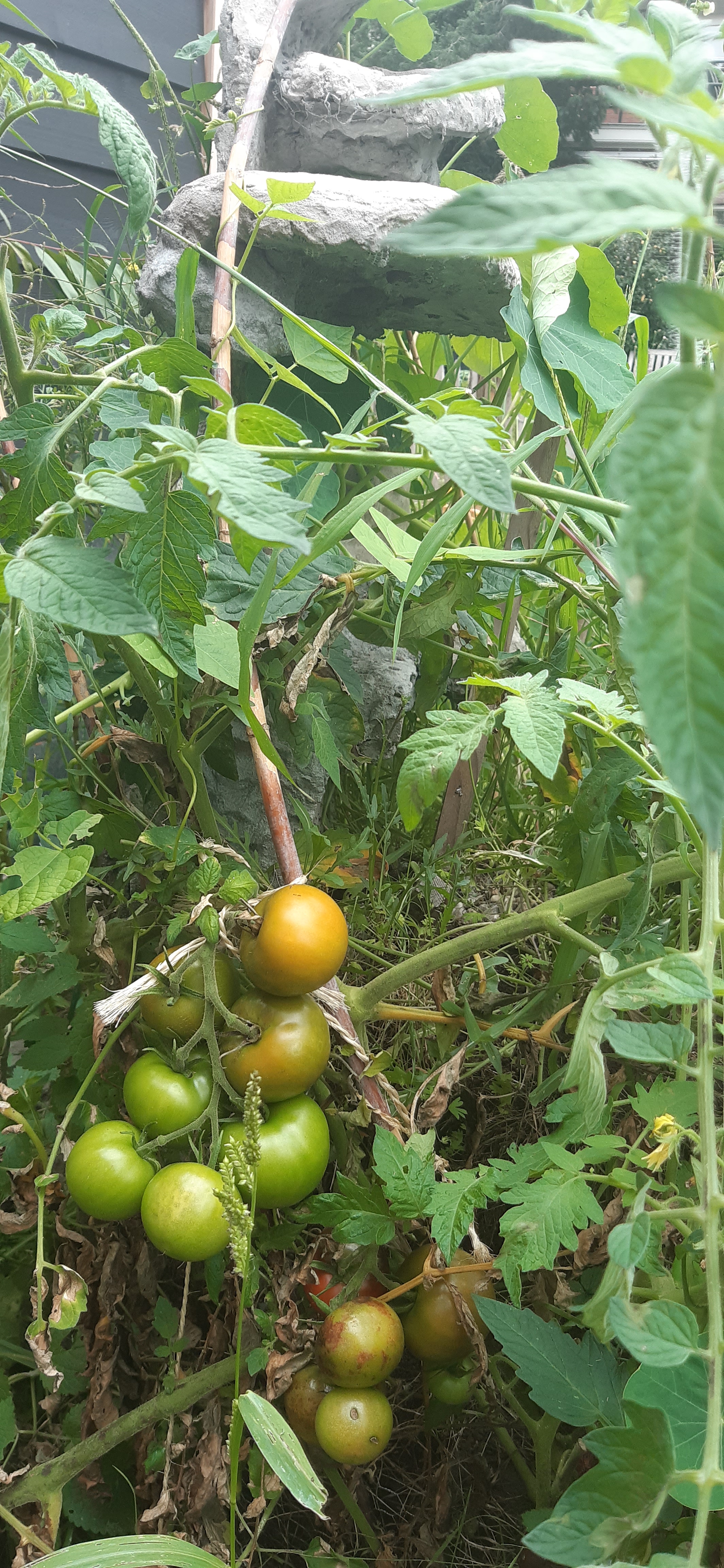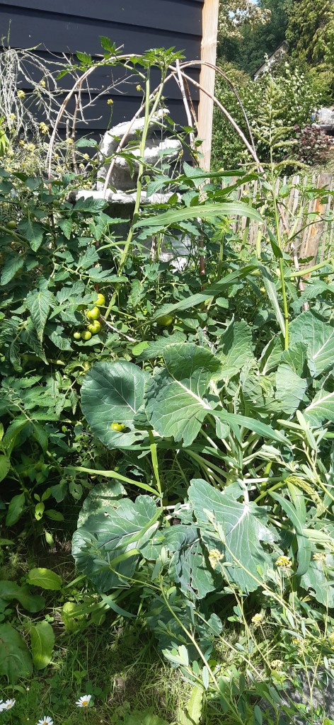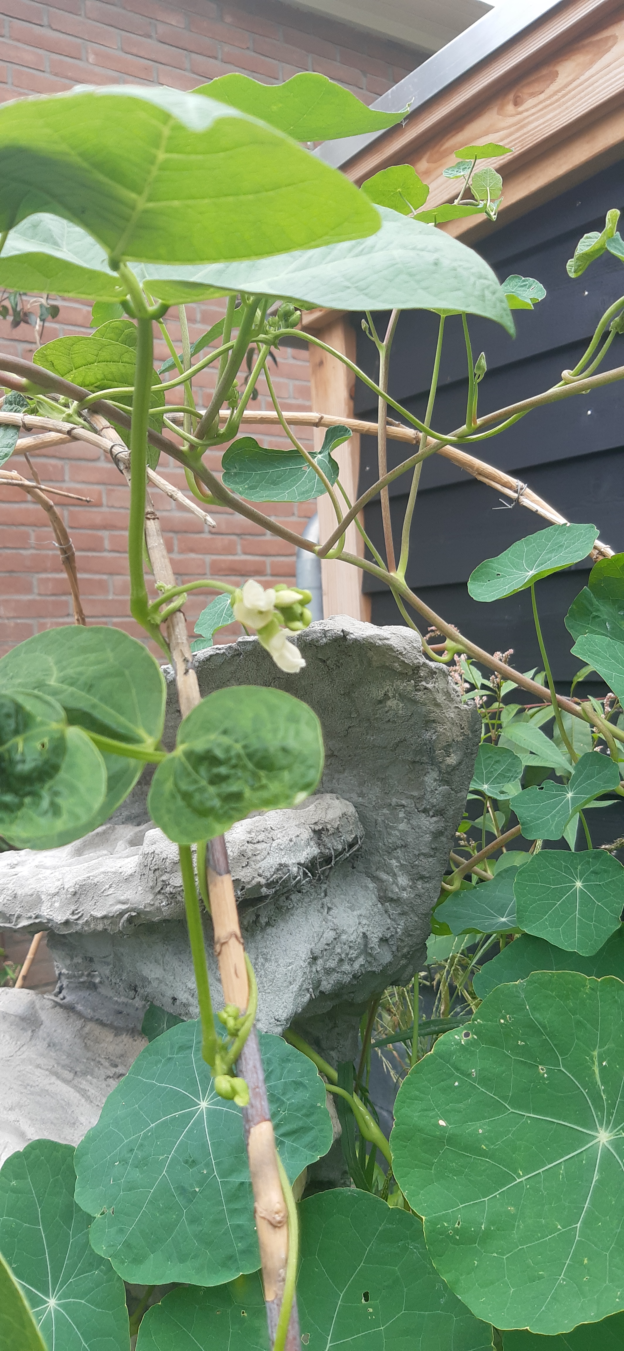 “.. moesten we af en toe een verschil in beleving overbruggen: hij zag zoiets als ‘water geven’ als een ritueel waarbij het water ‘bezield’ was, ik vind het meer H2O maar dacht met hem mee omdat het weer tot interessante vormen leidde. Hetzelfde over een wormenpijp , de energie die meekwam met getransplanteerd gras ( dus geen standaard graszoden..) . Of het daardoor komt zal ik nooit weten maar de etagère is vol leven en enorm veel tomaten. De eerste boontjes beginnen te bloeien en de Oost Indische Kers kronkelt zich overal doorheen.”