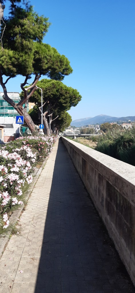 Loop langs de rivier die in deze tijd van het jaar bijna droog is en zo kom je in Imperia Oost, waar mijn gereserveerde hotel ligt. De oorsprong van het stadje is op de west oever; zoals logisch was in die tijd, werd de stad op een hoogte gebouwd.