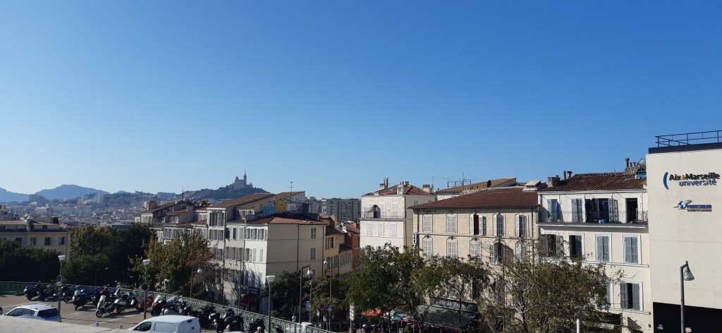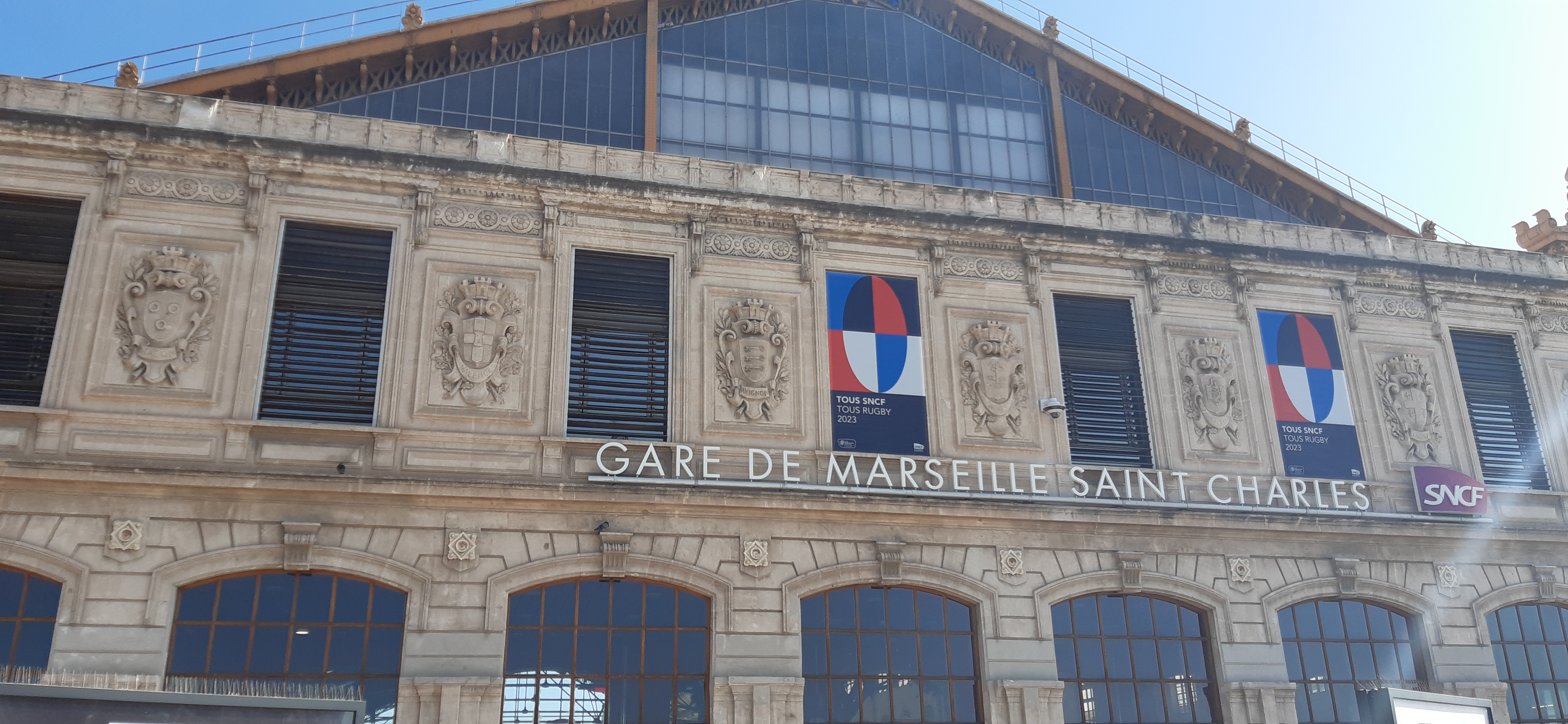 In Fréjus stoppen dus vrijwel geen doorgaande treinen. Volgens de app moet je eerst een station terug, naar St Raphael-Valescure, om daar op een directe trein te stappen. 11.44 Vertrekken en dan om 12.25 de aansluiting. De dame aan het loket bezweert me dat de trein om 12.25 vertrekt; de online dienstregeling laat daar een streepje zien bij Fréjus. ’s Morgens vroeg stopt er wel een doorgaande trein maar verder urenlang niet. Gelukkig, de app heeft gelijk. Om 11.44 terug naar het oosten, richting Nice. In St Raphael-Valescure is het station wel kaal en onherbergzaam aan de ene kant, waar ook het busstation is gevestigd, maar langs het andere perron is een uitgebreide stationshal met alles d’r op en d’r aan, inclusief horeca in de directe omgeving. Gezellig! Er zijn prima digitale mededelingenborden met vertrektijd en bestemming. Na verloop van tijd flitst er af en toe een klein berichtje voorbij: 10 minuten vertraging. Ja, laat het vooral niet te duidelijk zijn. De NS is op een gegeven moment ook overgestapt op de formulering: de trein komt over ca 10 minuten. Na 10 minuten volgt er een enorm lang verhaal door de krakende luidsprekers; “Qu’est-ce qu’il dit?” “Le train va arriver”. Aha! En bijna op de geplande tijd arriveren we op Marseille St Charles. Een prachtig kopstation! Hoog gelegen, met een plateau ervoor met uitzicht over de stad; je duikt zó het leven in. Druk bewoonde wijken met bewoners van alle kleuren, veel te doen.