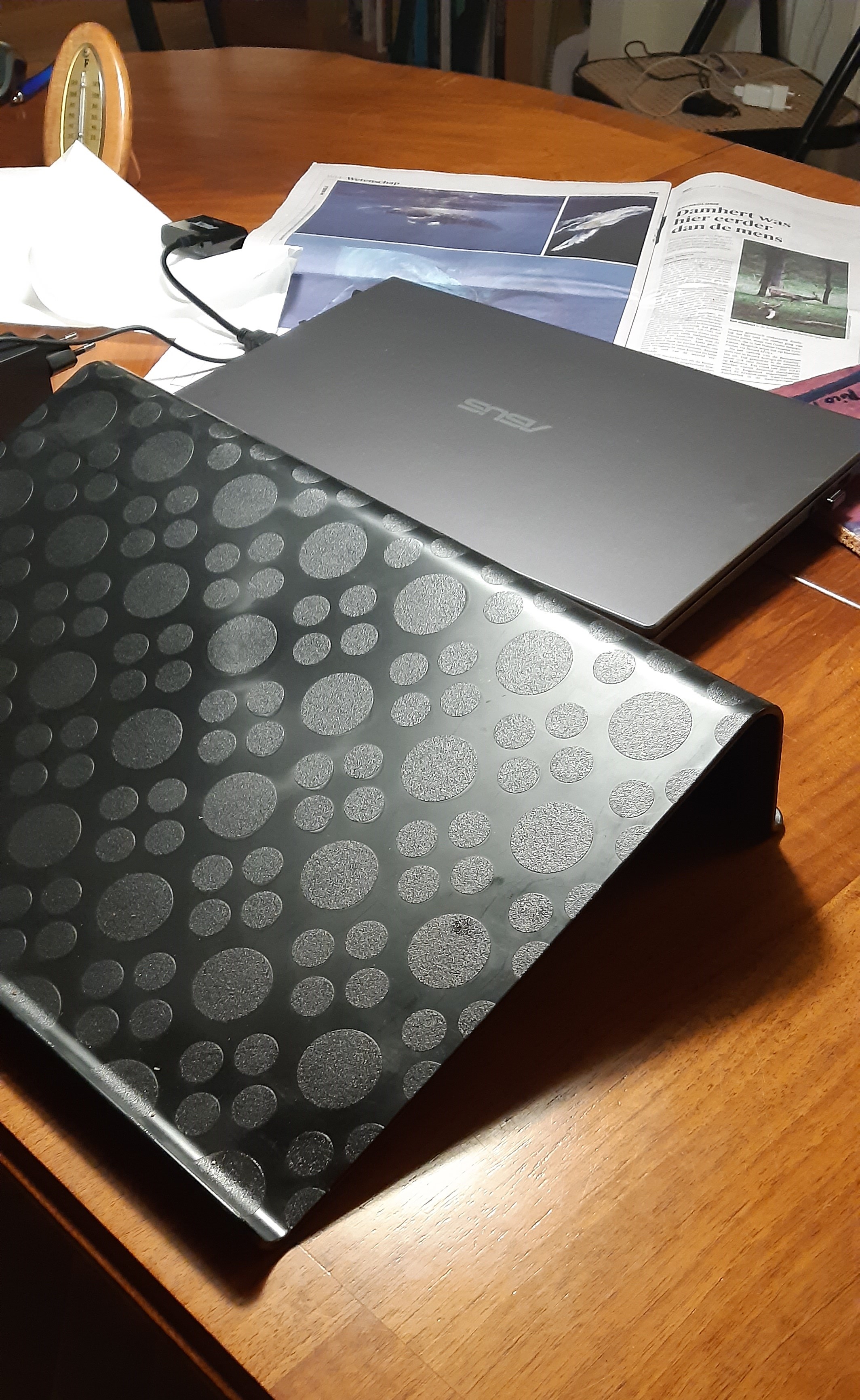 En toen viel mijn oog op mijn laptop die op een gewoon gekochte steun staat..