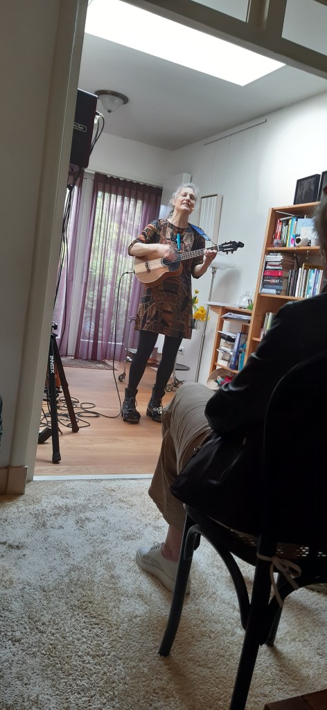 Waar het podium zou zijn, dat had ik al lang in gedachten. Maar de rest.. Eettafel weg, maar dichtbij genoeg voor de drankjes en snacks, rijtjes stoelen die overal vandaan kwamen (die ene grote lekkere stoel daar achteraan in het hoekje) en dan zo neerzetten dat iedereen goed zicht heeft – op wie? Ha, daar zijn ze! Mieke met haar chauffeur, techniekman en adviseur (én geliefde..) alles in één persoon, mét muziekinstrumenten en geluidsinstallatie. Mieke is trouwens een zangeres mét begeleiding alles in één persoon, dus dat treft. Even rondkijken, beetje aan elkaar snuffelen, geluid proberen, achtergrond, lichtval.. en voordat we zover waren:
