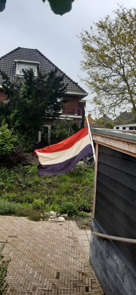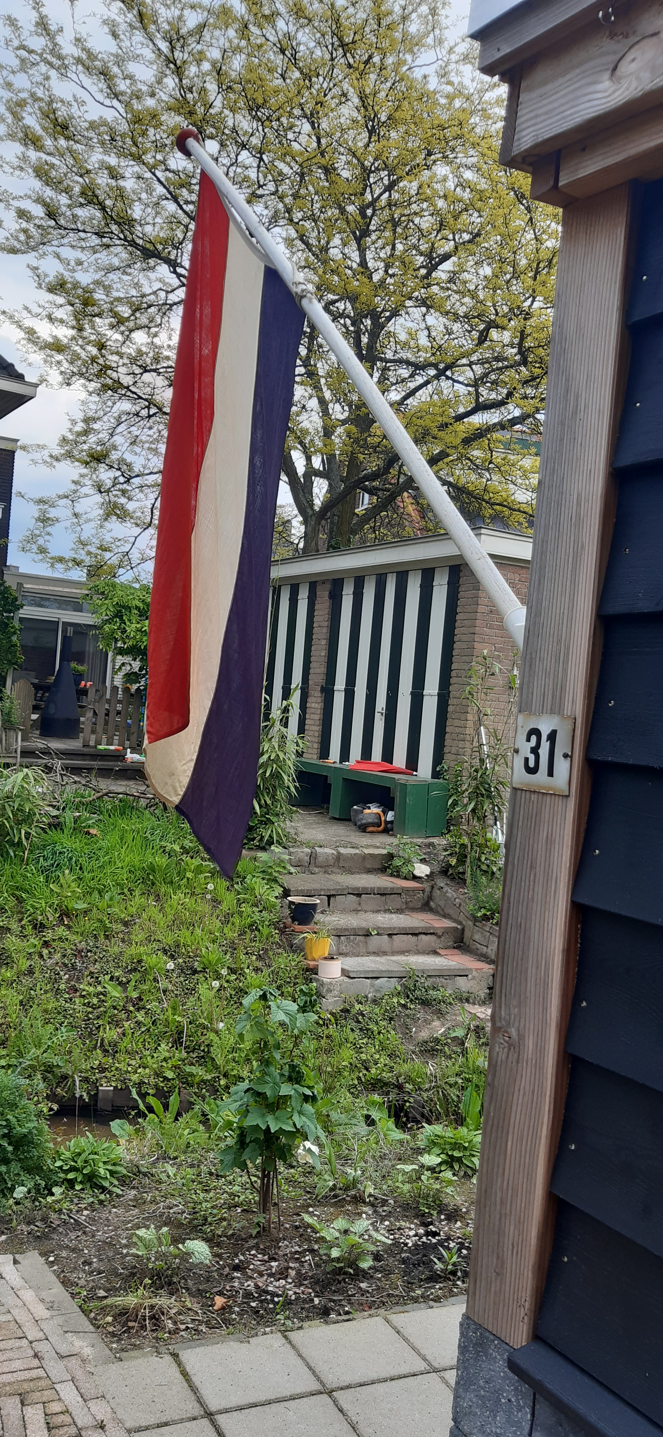 Nu bijna 30 jaar geleden verhuisde ik naar Velp – met de vlag én de vlaggenstok. Maar er was eigenlijk geen logische plaats voor de vlag: veel hoge bomen voor het huis. Toen dat wat minder werd kocht ik – hoopvol – eens een vlaggenstokhouder, van plastic wat ik eigenlijk weerzinwekkend vond maar ja.. Dat ding lag jarenlang in een bak met ‘nog eens nuttige zaken’ zoals veel mensen die hebben. En bij elke 4/5 mei dacht ik weer: Zou ik eens moeten regelen.