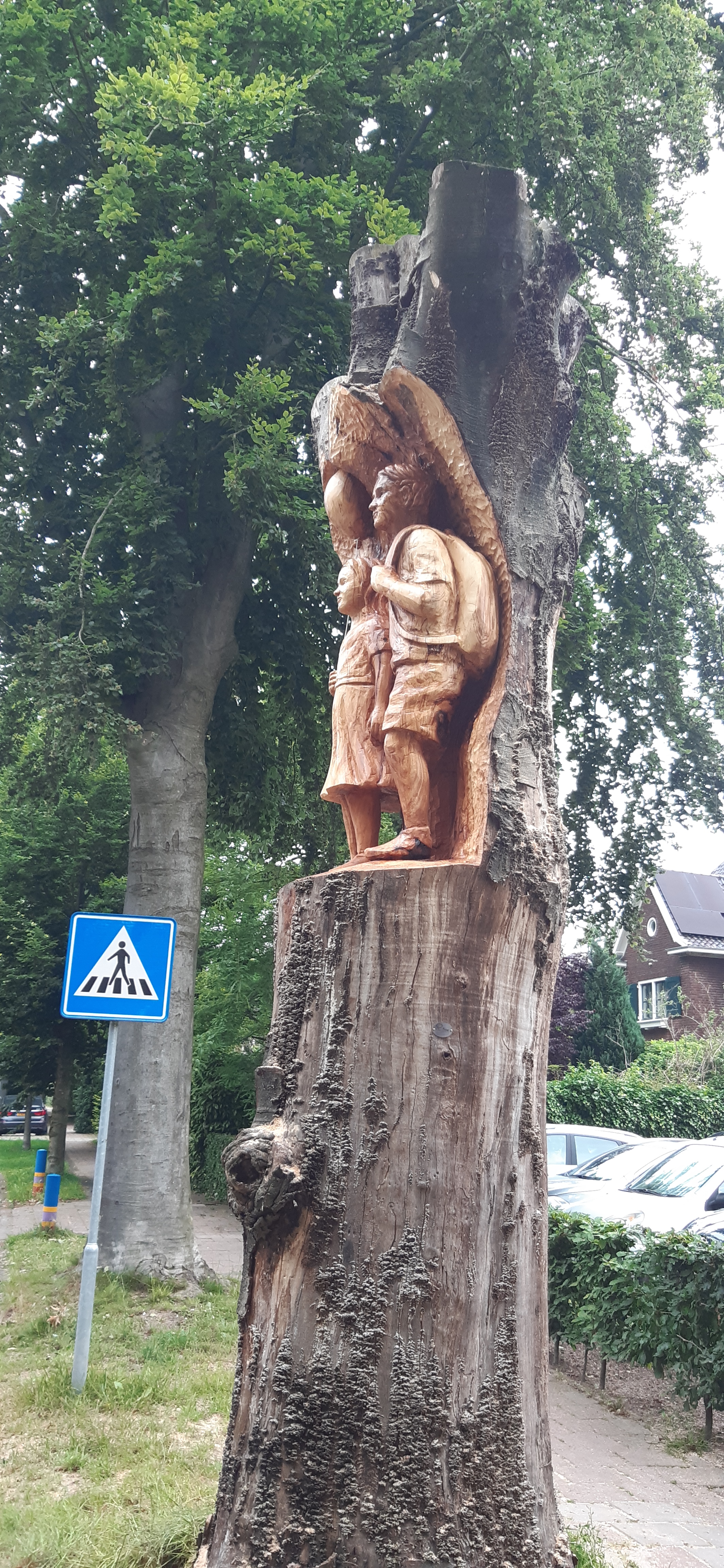 Op de stam zie je nog de zwammen, bovenin zie je hoe de stam is gesplitst. De kunstenaar heeft gebruik gemaakt van wat er was en: een paar kinderen onderweg, met een ballon en met een rugzak. Waar gaan ze naartoe? Dat is aan ieders verbeelding. Misschien steken ze over naar de school, of ze zijn op weg naar het dichtbij gelegen bos. Of ze lopen een fantasiewereld in.. Wie weet?