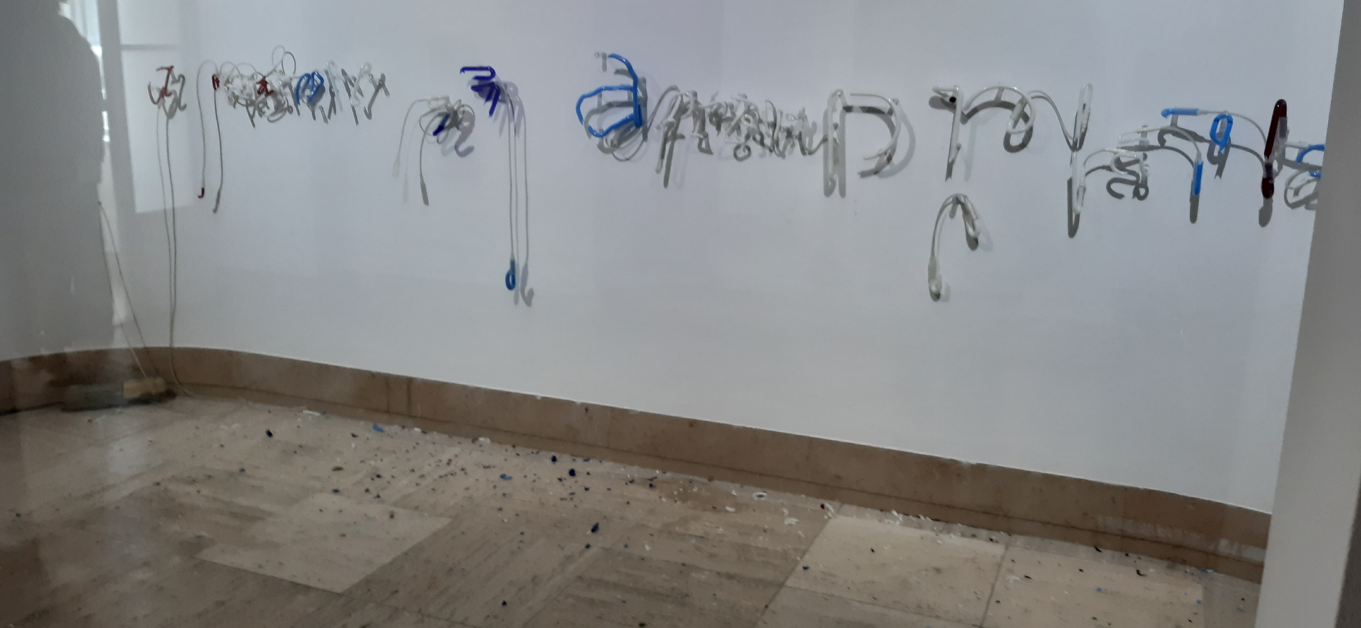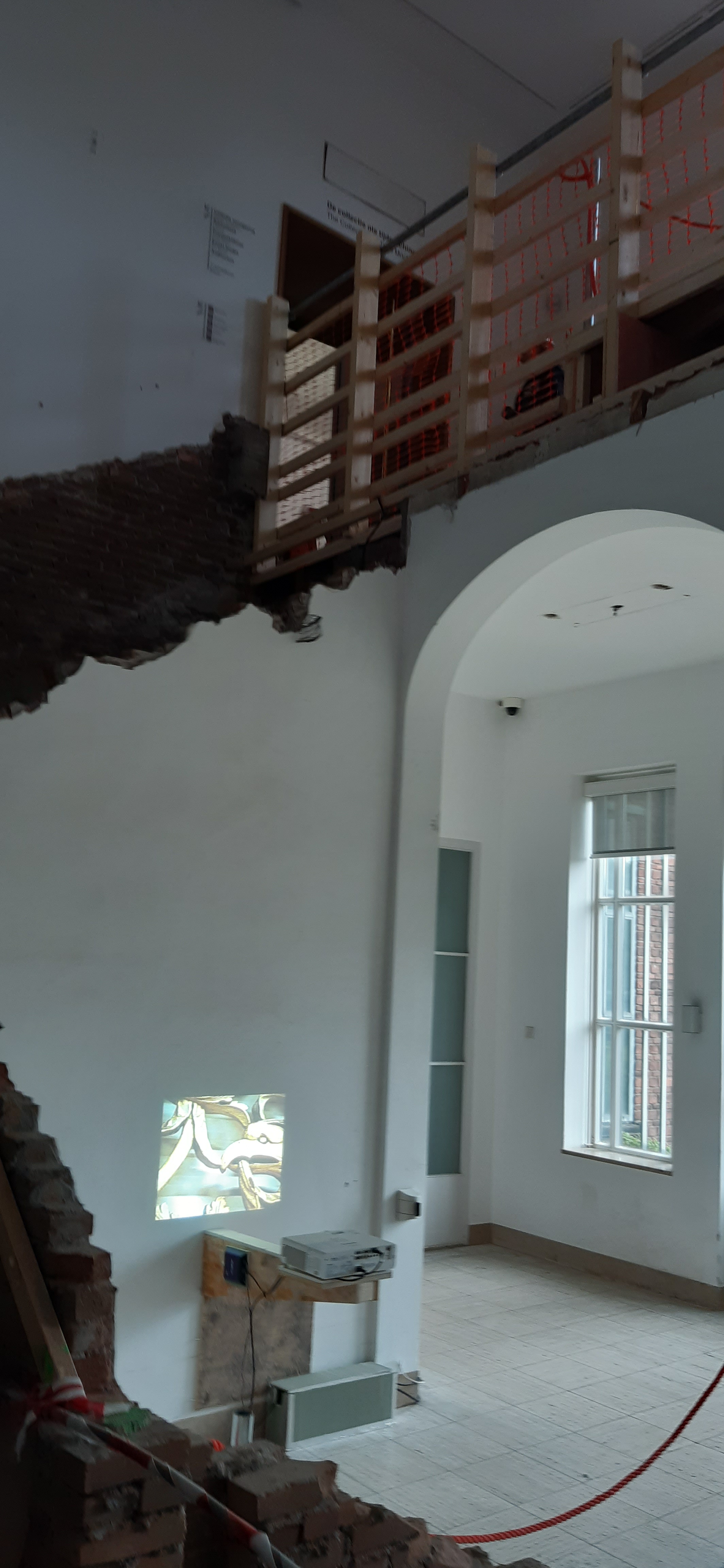 Het wordt een wandeling van zo’n anderhalf uur; het gebouw is kaal, hier en daar staan nog teksten met verwijzingen naar afdelingen, restaurant en dergelijke. Je herkent eens een trap, die oude ingang met die vier grote vitrines, er zijn verwijzingen naar eerdere projecten en kunst die er ooit was; en er zijn ook speciaal voor de gelegenheid gemaakte dingen. Bizar om midden tussen het puin een vitrine met bekend mooi glaswerk te zien, en een blik te werpen in een galerij met porselein of spiegelende bollen van Maria Roosen.