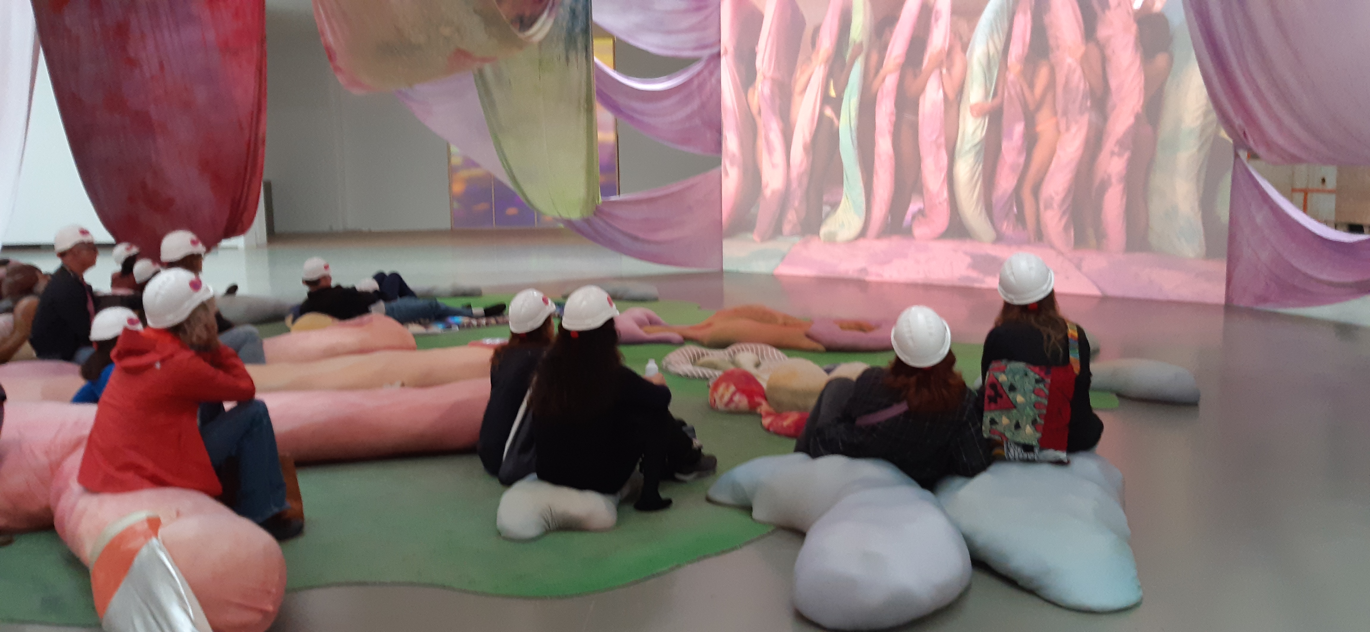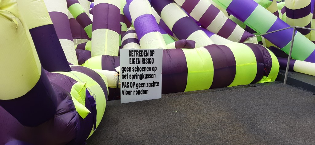 En de uitgang van de tour is op de binnenplaats – die gevuld is met bewegende slurven. Er is ook een springkussen.