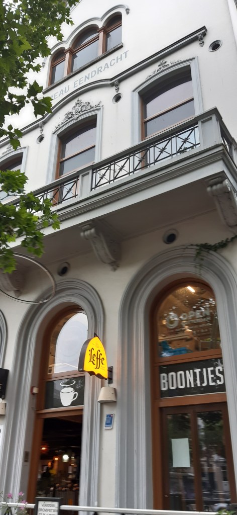 Onderweg van CS, wat een fijn station is dat geworden, een groet aan het nieuwe beeld waarmee altijd mensen op de foto willen, een aangename wandeling naar het museum, koffie?? Aha, een aardige tent: