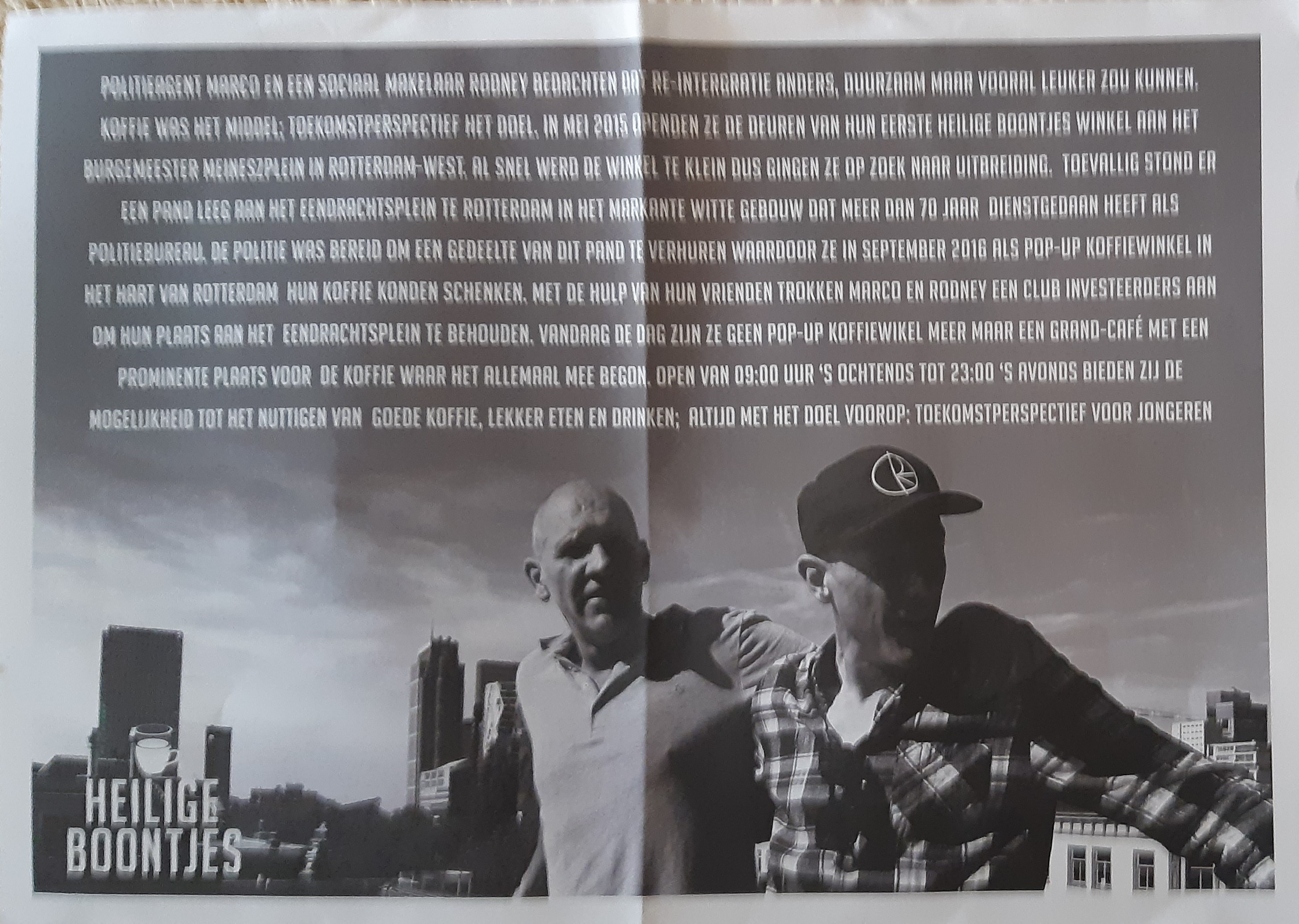 Het is een sociale onderneming waar werk is voor iedereen; begonnen rond een koffieleveringsbedrijf Heilige Boontjes, en daarna de kans gegrepen om in het voormalig Bureau Eendrachtsplein een horeca te beginnen.