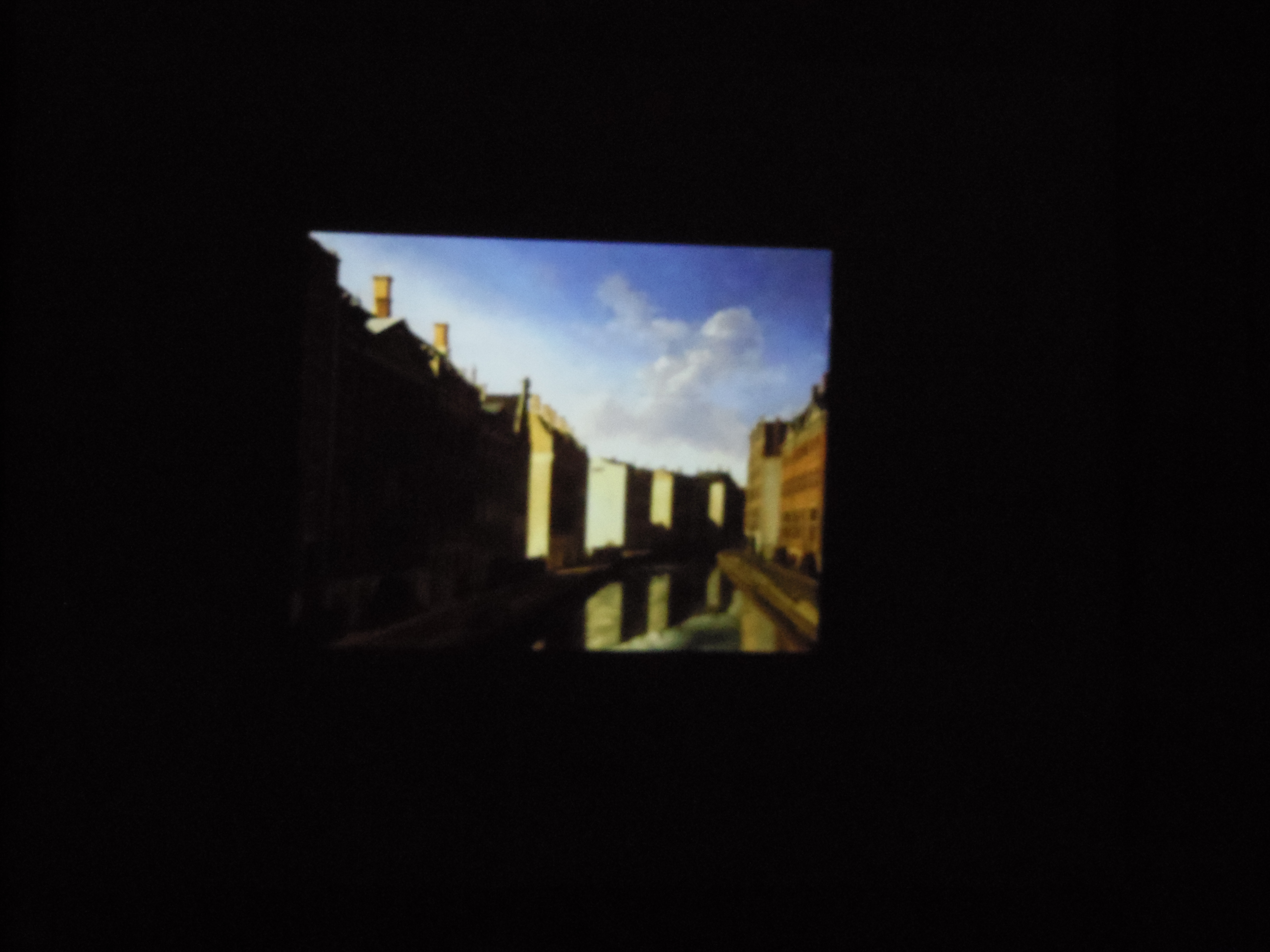 In het Goethe huis een projectie van een beroemd schilderij van de Gouden Bocht, met een uitgesproken verhandeling over projectbrochures, geldstromen en het opmerkelijke feit dat dit schilderij ineens in het nieuws kwam omdat het een rol speelde bij een van de eerste omgevallen banken.