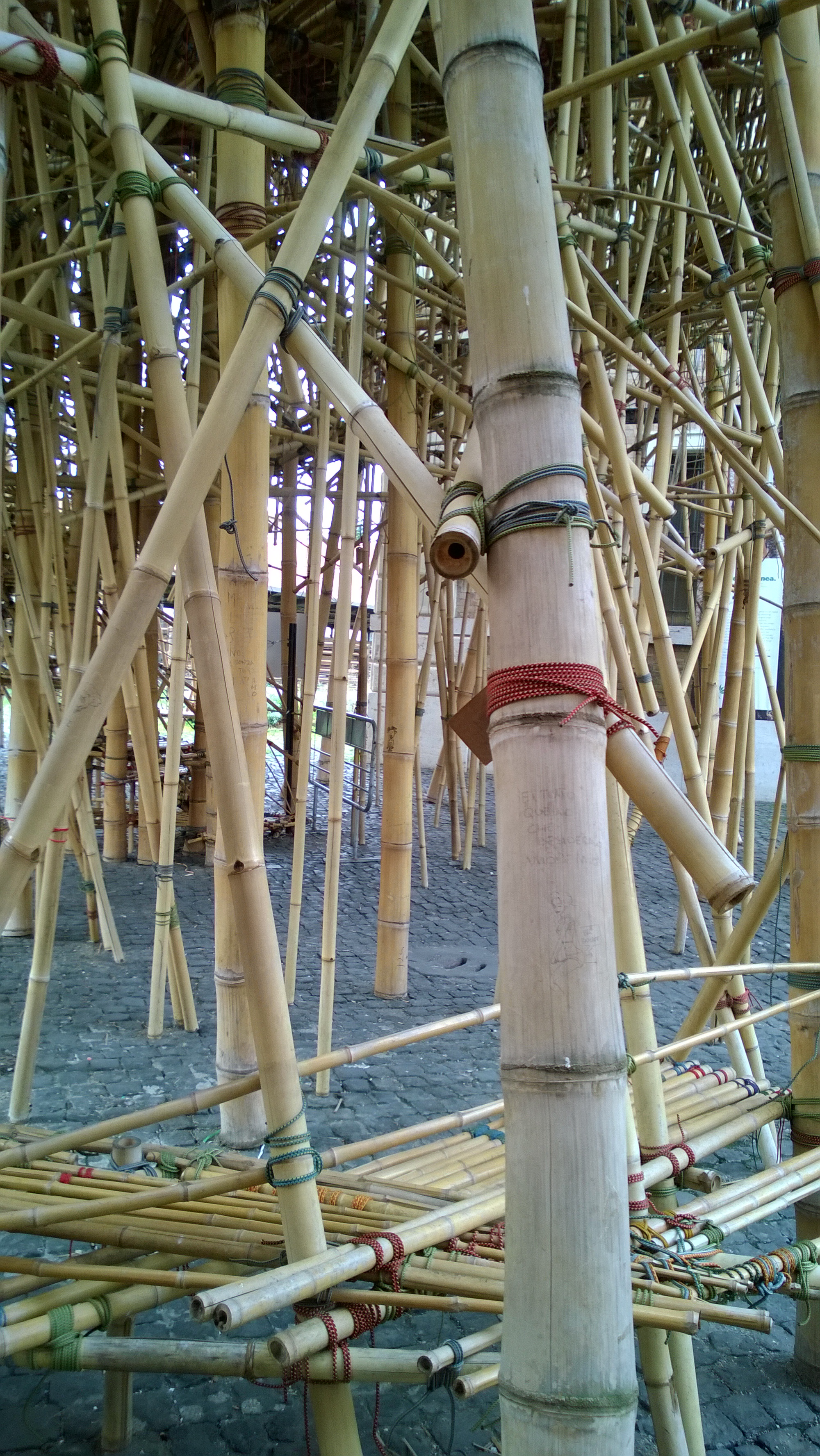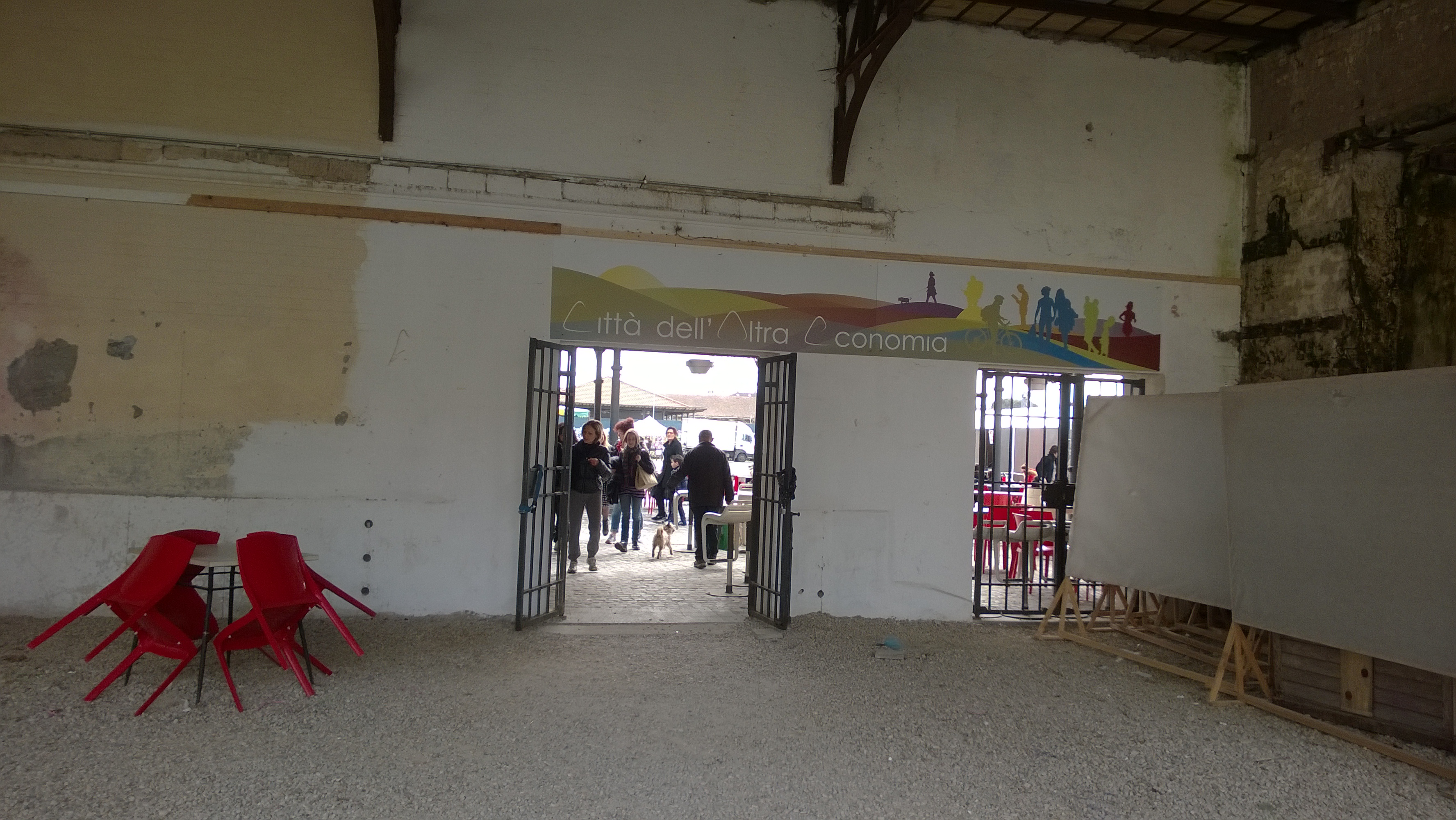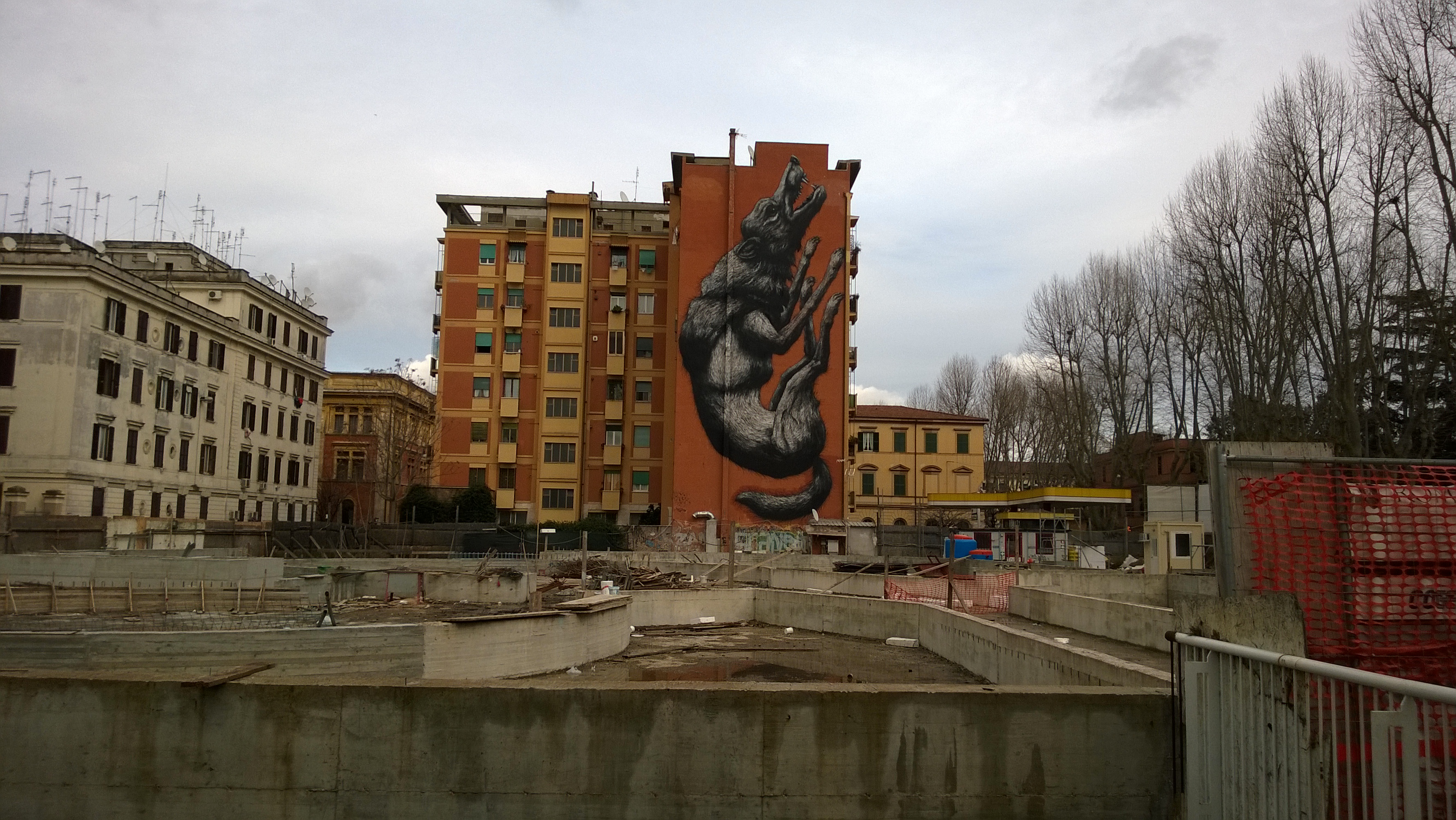 Die tegenstellingen dan. De buurt waar ik verbleef was niet bepaald luxe, hoewel ik denk dat een huisje daar al een flinke huur moet opbrengen. Mijn appartementje was onderdeel van een blok met een gezamenlijke buitendeur, en als ik zo even de constructie probeerde te begrijpen acht allemaal kleine woningen, 1 of 2 kamers. Af en toe hoorde ik buren aankomen of vertrekken over de mini-galerij. De gewassen lakens hingen aan de waslijnen in de binnenplaats, die nu (februari/maart) nog vrij kaal was maar de belofte van een groen paradijs in zich had, De winkeltjes zijn over het algemeen klein, overleven maar net, zo te zien. De straat slecht onderhouden; veel kuilen en gaten, opgelapt asfalt. Het eco-eiland (de afvalcontainers..) een concentratie van zwerfvuil. Om de hoek de Lungotevere (oftewel de straat langs de Tiber) met flats 9 hoog, groentestallen langs de kade, een parkeerplaats van 3 rijen dik kleine autootjes (dat is trouwens het algemene beeld, en de Smart wordt standaard dwars geparkeerd). De brug is met marmer bekleed. Langs de oevers huizen de daklozen in onduidelijke optrekjes. Aan de overkant een monument: het voormalige abattoir. Dat wordt herontwikkeld. Er is al een museum en een architectuuropleiding; aan een open eind een alternatieve vrijplaats. WP_20150222_014  WP_20150222_020