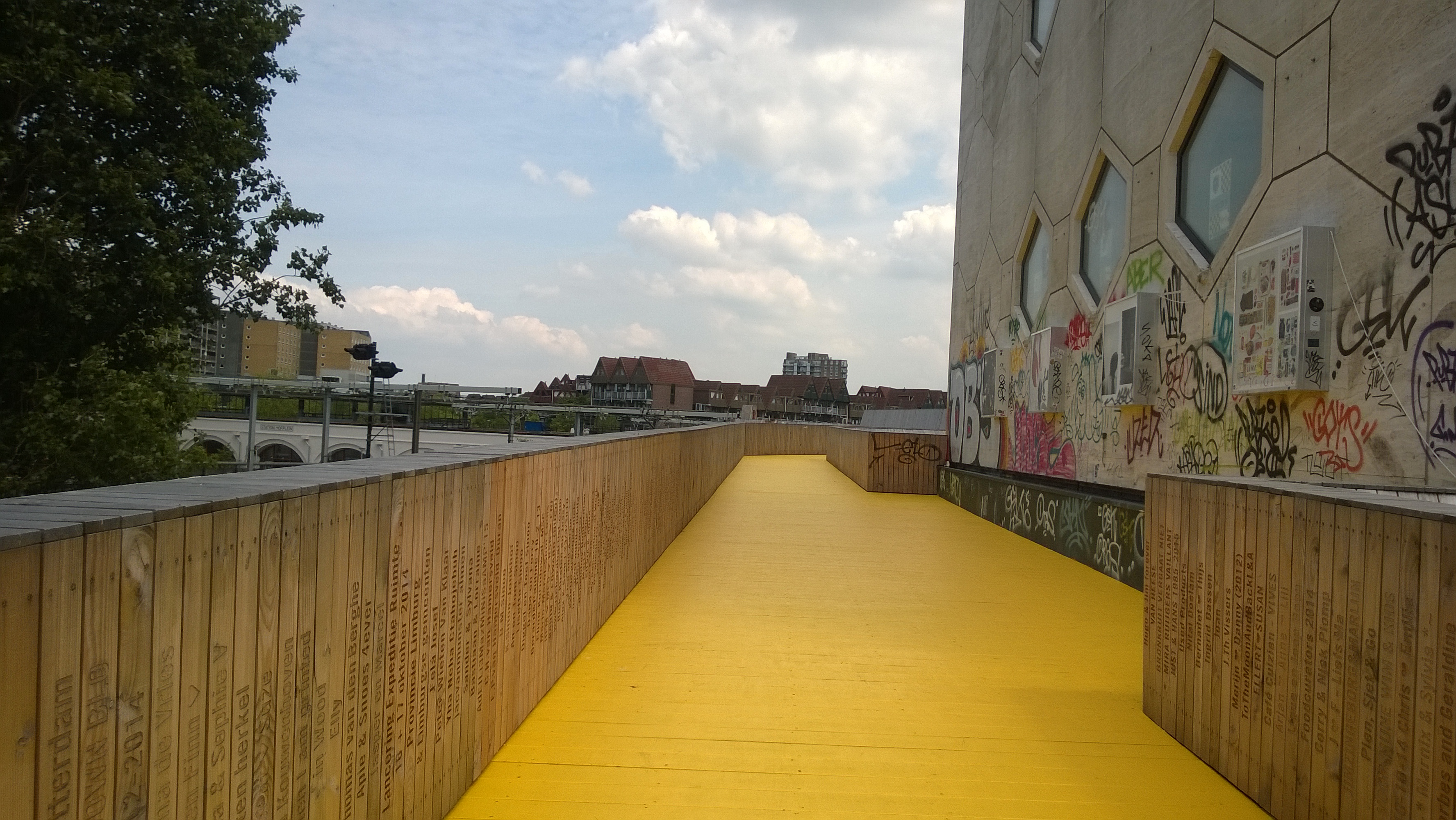 Op 20 juni 2015 werd de Luchtsingel officieel en feestelijk geopend, op de Dag van de Architectuur, met een Urban Picnic. O ja,… en dus nam ik wat vroeger de trein naar Rotterdam CS en bewonderde de Luchtsingel; een gele loper die een opvallende opening heeft aan de kant van CS